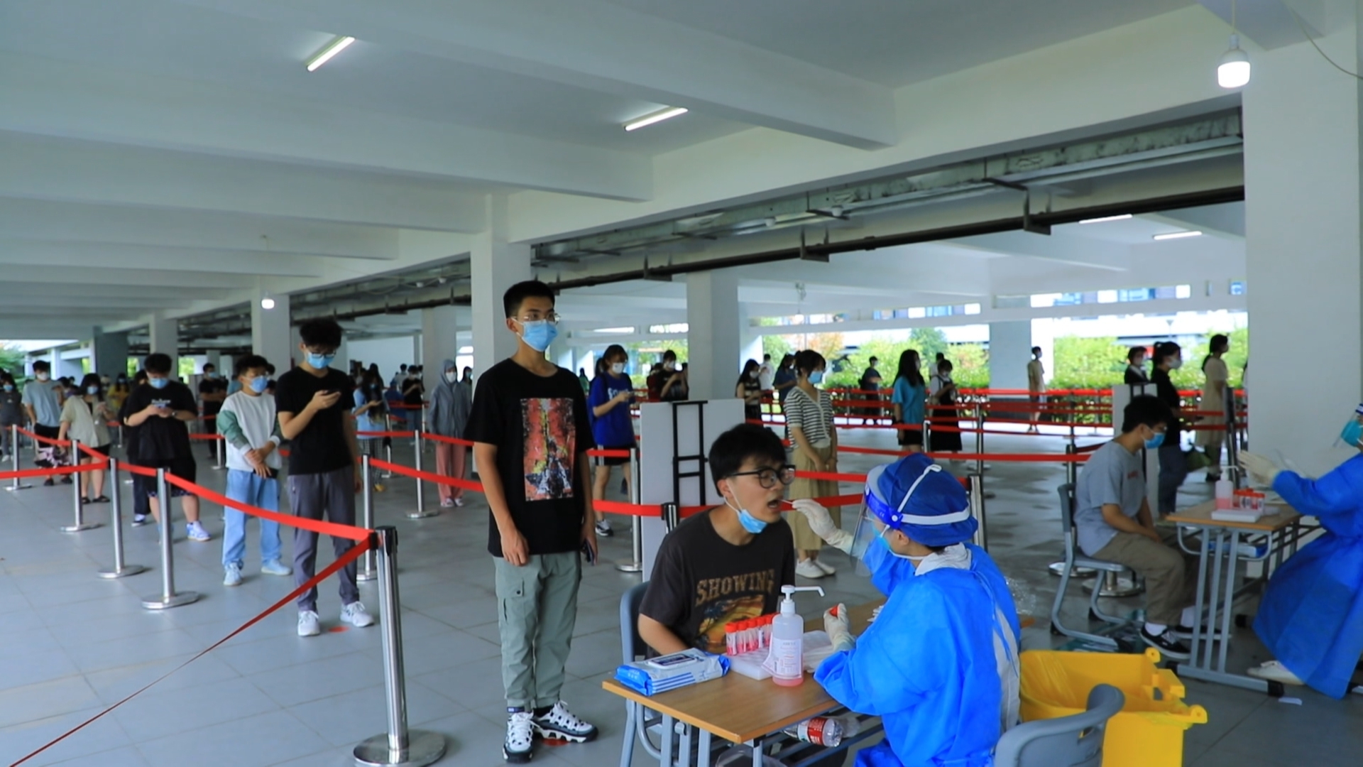 下午1点半,在浙师大行知学院,来自兰溪市人民医院的医护人员,正在对在校师生进行核酸采样。浙师大行知学院共有八千余名学生,根据疫情防控需要学校在开学之初就做好防疫物资储备、环境卫生清洁和消杀等工作,外来人员需持48小时核酸阴性证明方可进校。同时,每一位在校师生,每天早晚进行两次健康监测打卡,如果体温出现异常,学校还专门设置了疫情防控综合服务点,供师生使用。