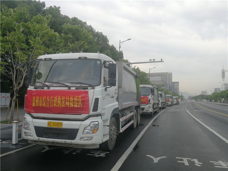 昨天,市区两级综合行政执法局联动,组织环卫力量赴乐清大荆和永嘉岩头,帮助灾区清理道路,处置各类垃圾。乐清、永嘉、洞头三地,得知清理工作正有条不紊进行中。