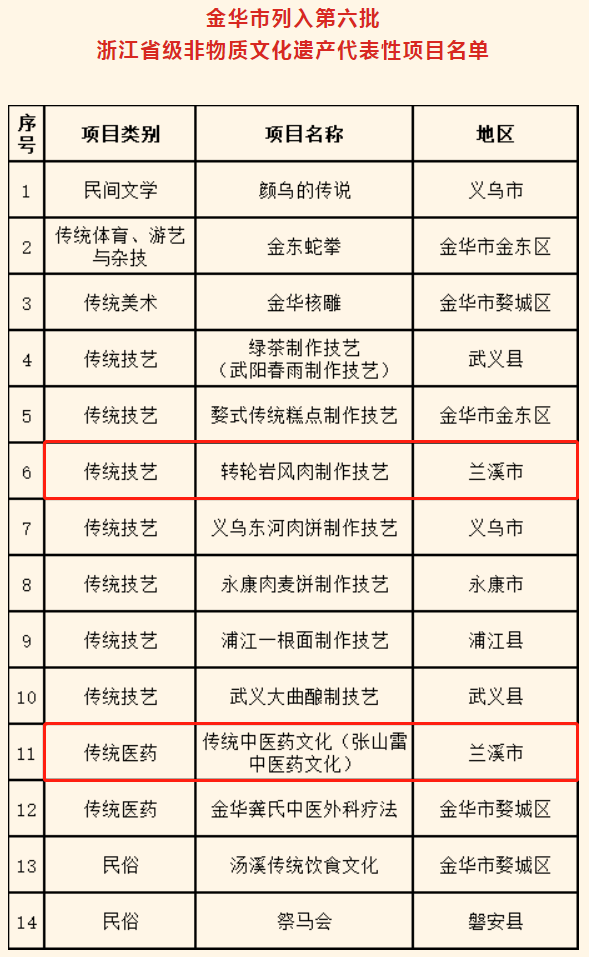 近日,浙江省人民政府公布第六批省级非物质文化遗产代表性项目名录110项,其中金华各县(市、区)共有14个项目在列,兰溪张山雷中医药文化、转轮岩风肉制作技艺入选。