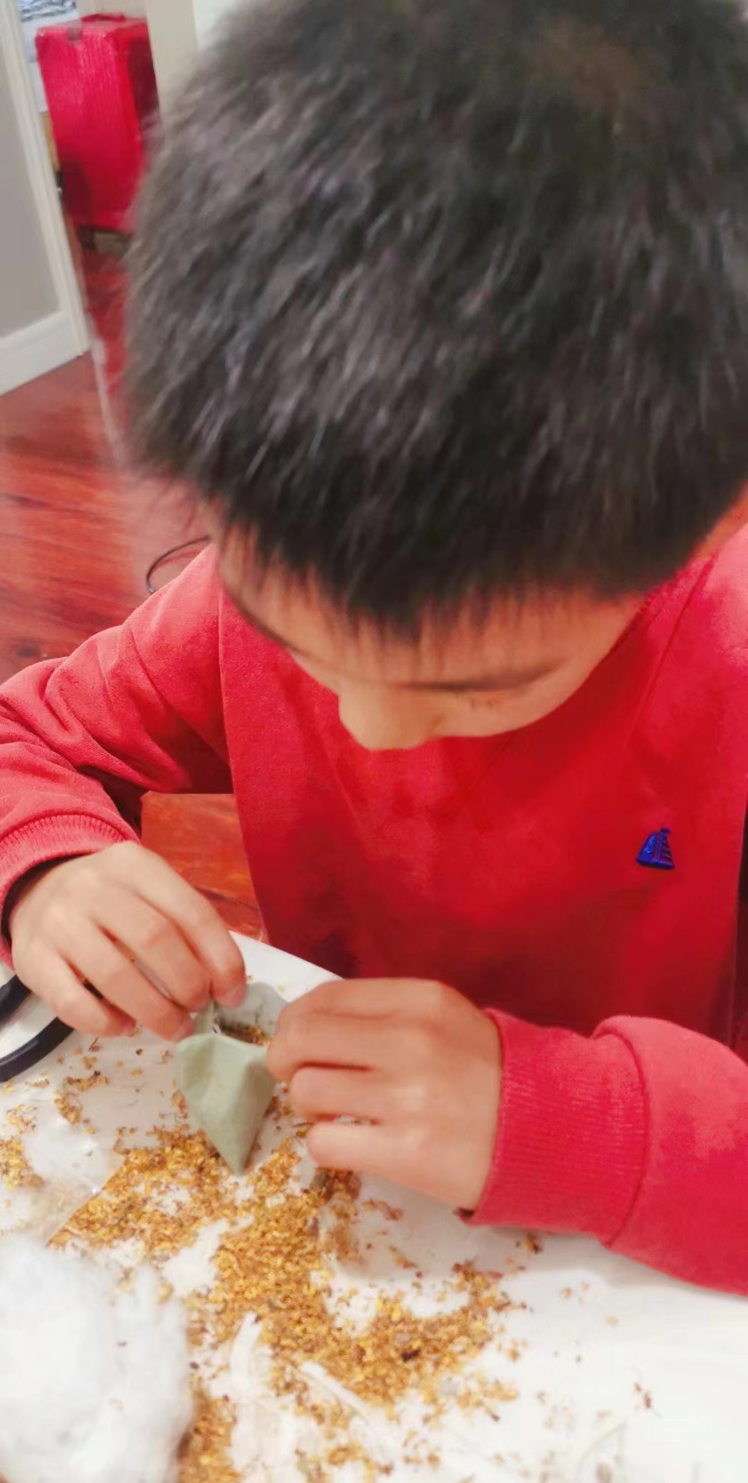 受清儿的影响,儿子也喜爱手工,清儿也有意锻炼他,做桂花包时,让他将桂花一点点填塞进去。她发现,儿子的小手比大人的手更适合操作。日积月累,儿子做手工的水平不断提高,做出来的作品常常受到老师表扬,连饺子皮都擀得特别好。