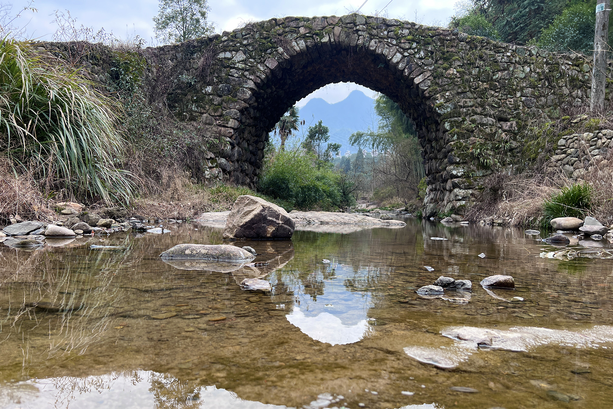 桥下的溪流缓缓流动,桥体呈自然弯拱之状,由溪滩上大大小小的天然鹅卵石砌筑而成,衔接时没用一点一滴的泥浆。历经几百年,依然屹立不倒。