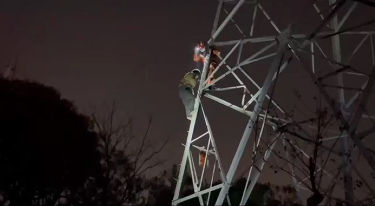 “你们不要上来,不然我就往上爬!”消防、公安、电力等部门人员极力劝说,但妇女情绪愈发失控,又往电线塔上爬了三个阶梯,这让底下的人都捏了把汗。据现场电力技术人员介绍,整座电线塔近30米高,上端有高达11万伏的高压电流,如若再往上爬,后果难料。