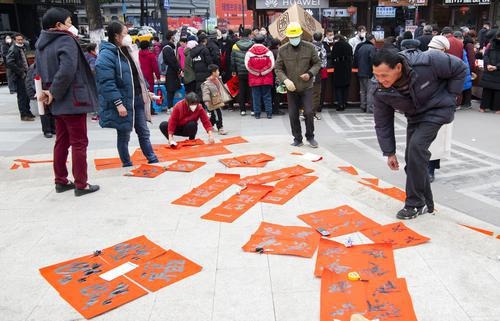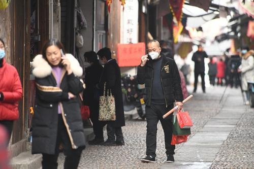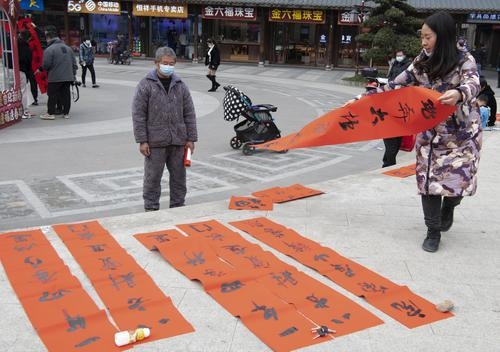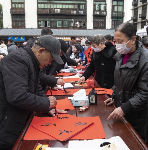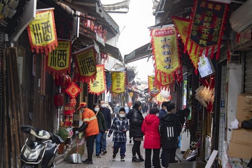1月11日,在义乌市佛堂镇老街,红灯笼、中国结、各具特色的老式店招挂满街道两边,呈现出浓郁的节日喜庆气氛。居民逛街购买各种土特产年货,大袋小袋满载而归;书法家们忙着挥毫泼墨,写春联送给百姓。