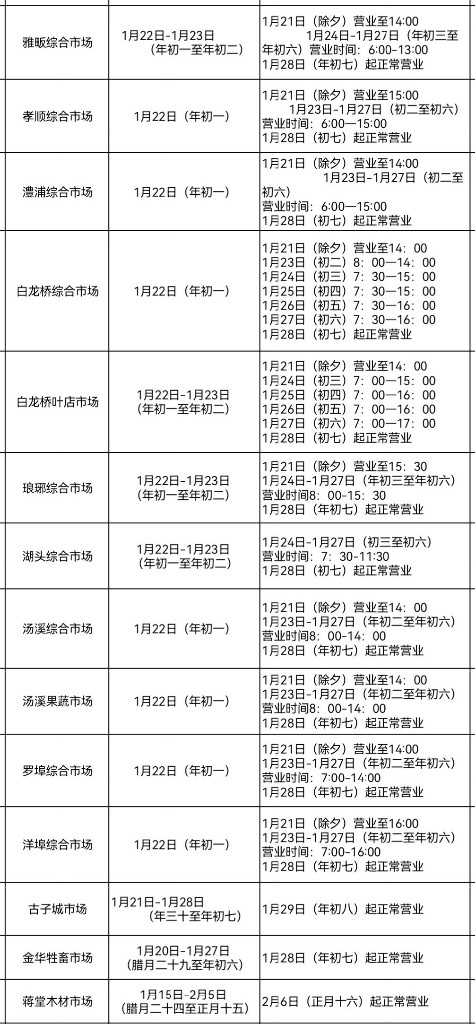 曙光菜市场:1月22日至26日(正月初一至正月初五)休市,1月21日(除夕)营业时间至13:00,1月27日(正月初六)起正常营业。
