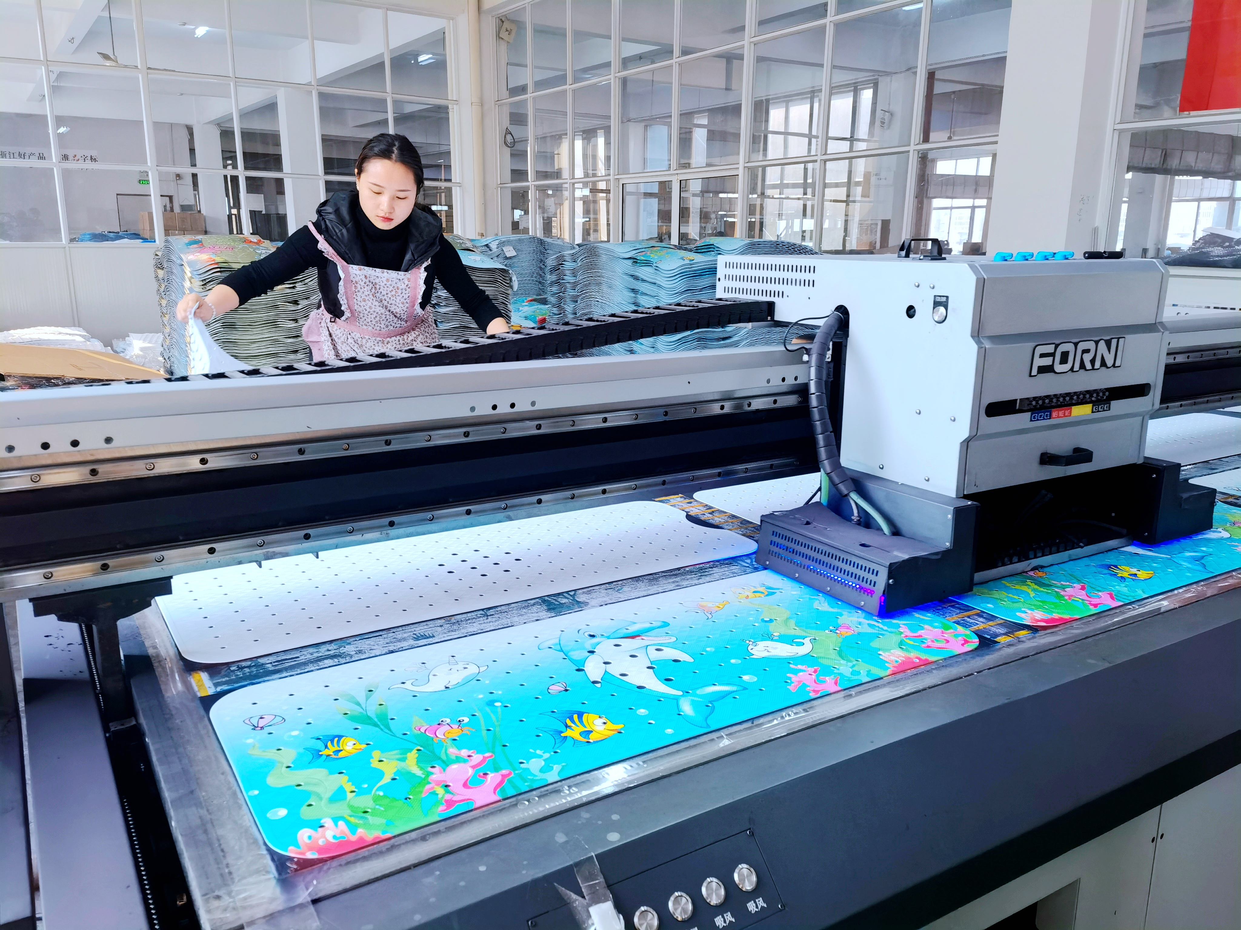 走进生产车间,只见随着辊筒不断地转动,一台数字彩喷机左右来回移动,一幅幅美丽的画面定格在一块块塑胶片上。企业生产主管告诉记者,在智慧工厂生产执行系统操作下,一台台智能注塑机和数字打印机正“紧锣密鼓”地赶制着年初“开门红”的订单。