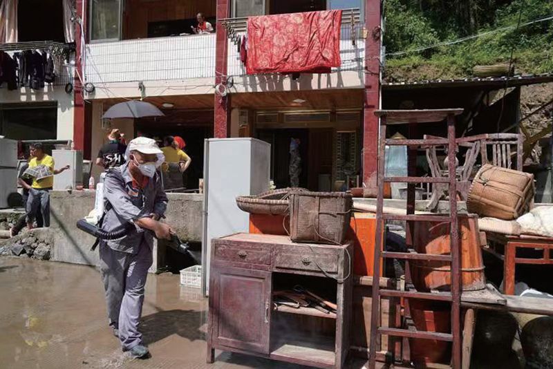 洪水过后,山早村开展消毒防疫工作。刘伟 摄