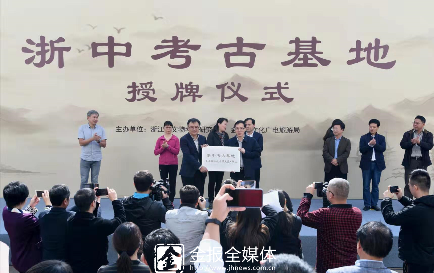 今天,由浙江省文物考古研究所与金华市文化旅游广电旅游局共同组建的浙中考古基地在金华挂牌。金华经济技术开发区金西管理中心举行隆重授牌仪式,省文物局副局长曹鸿为我市授牌,金华市政府副秘书长叶顺清上台接牌,市文化旅游广电旅游局局长方宪文向金华经济开发区管委会授牌“浙中考古基地——金华经济技术开发区工作站”。
