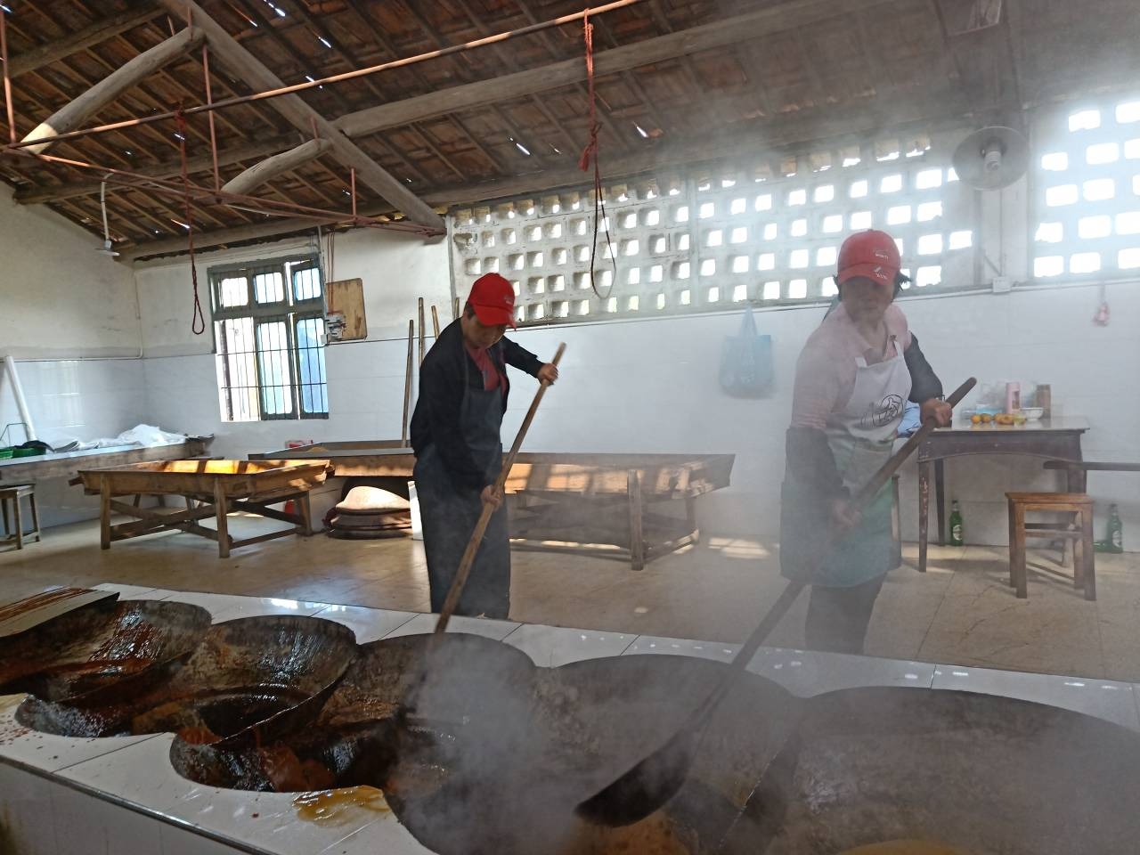 在女埠街道汇潭村吴常青的红糖加工作坊里,记者看到,几口大锅一字排开,制糖师傅正在忙碌着烧糖、舀糖、滗糖等等,每口锅里都热气沸腾,熬到一定时候锅中的甘蔗汁就变成了金黄色的糖浆,站在红糖作坊外的不远处,都能闻到空气中飘散而来的这股“甜蜜”。