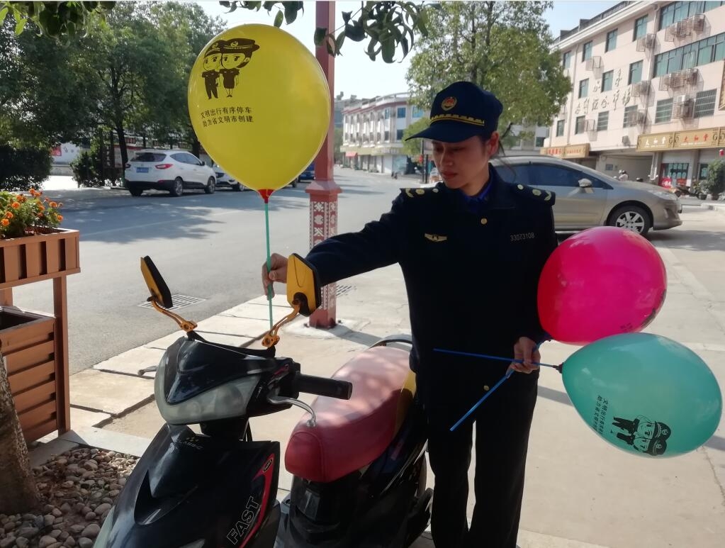11月14日上午,在兰溪水亭畲族乡的集镇上,不少非机动车上飘起了五颜六色的气球,这些气球上还印有“文明出行有序停车 助力省文明市创建”等字样。原来,这是兰溪市综合行政执法局水亭中队为了宣传文明停车想出的新点子。