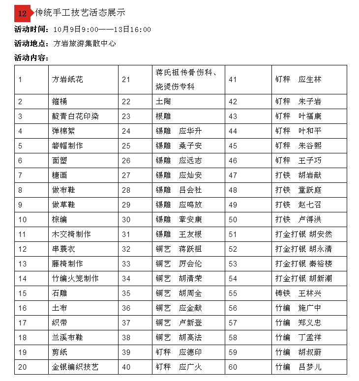 以上节目表演路线:方岩旅游集散中心——方岩山胡公殿——南岩民俗文化广场(其中推车、旋车节目不上山表演。另外,庙会期间方岩景区每天表演调花钹、自敲自打非遗节目)。