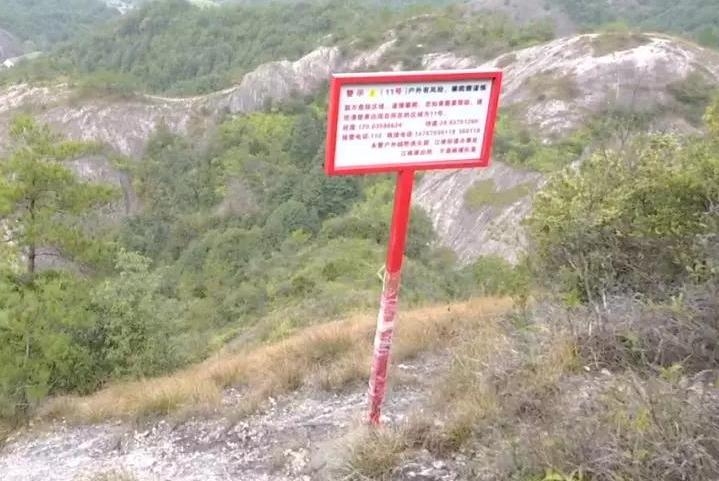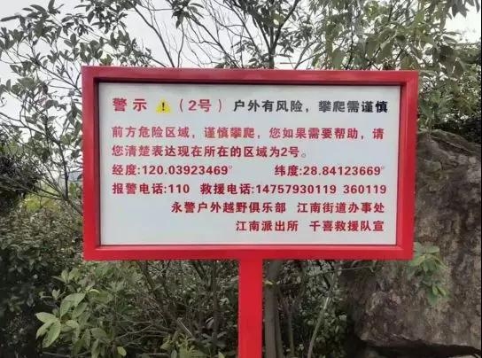 在每一块路牌上都有警示标语,提醒市民前方为危险区域,谨慎攀爬,还提供了报警求助的电话。不同的是,每块路牌都自带编号和所在位置的经度纬度,可以快速又准确地为救援提供位置信息。