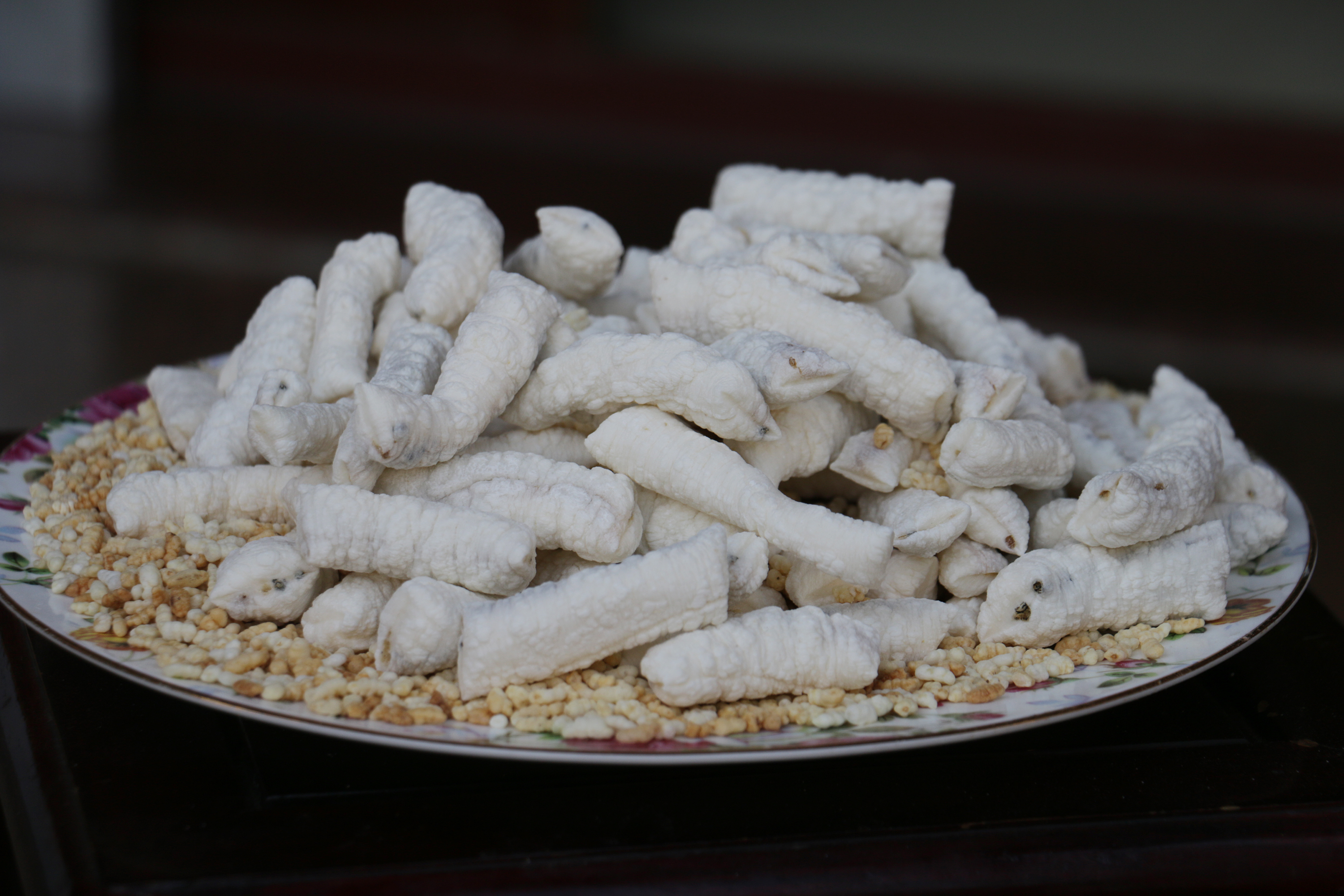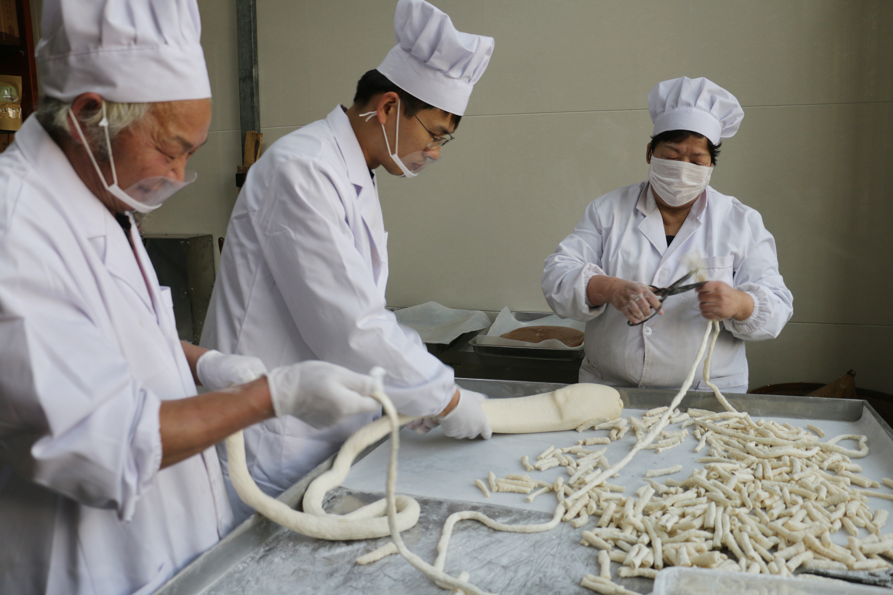 抽白糖是一项费时费力的活,从凌晨三四点蒸糯米饭开始,经过发酵、挤水、煎熬、抽打,到剪裁成品,前前后后需要20多个小时。白糖的原料是糯米和大麦。大麦催芽后切碎,将捣碎的麦芽与灼热的糯米饭混合,密封发酵,将其发酵滤液置大锅熬成糊状糖油,然后置米筛上晾10分钟左右,成琥珀状糖块,用木棒如拉面般不断地拉扯至白色,而后,抽成细条剪成小段。抽细条的力道把握非常有讲究,抽得均匀、馅不外露全凭经验,是件技术活。永康人所说的“抽白糖”,其实主要指的就是最后这一步。直接抽成小手指粗剪断的为纯白糖;里面缀上芝麻红糖,抽出来有馅的,为夹心白糖。