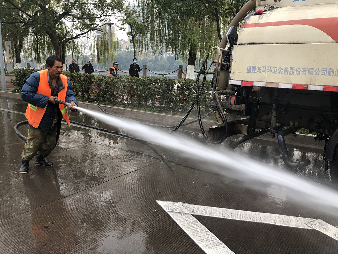 为了给运动员和市民提供洁净优美的赛道和观赛环境,永康市综合行政执法局环卫处工作人员提前“抢跑”,对赛道及周边进行彻底洗刷,全力做好赛事环境保障工作。