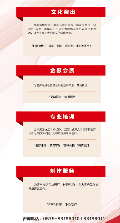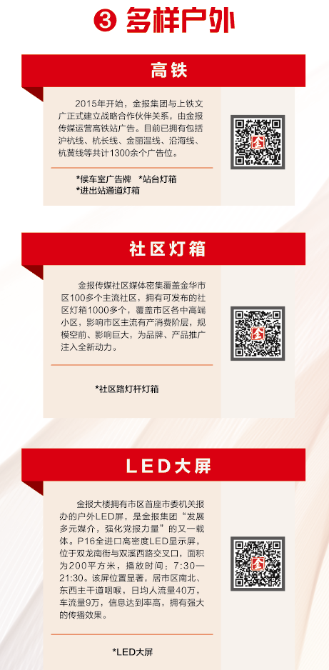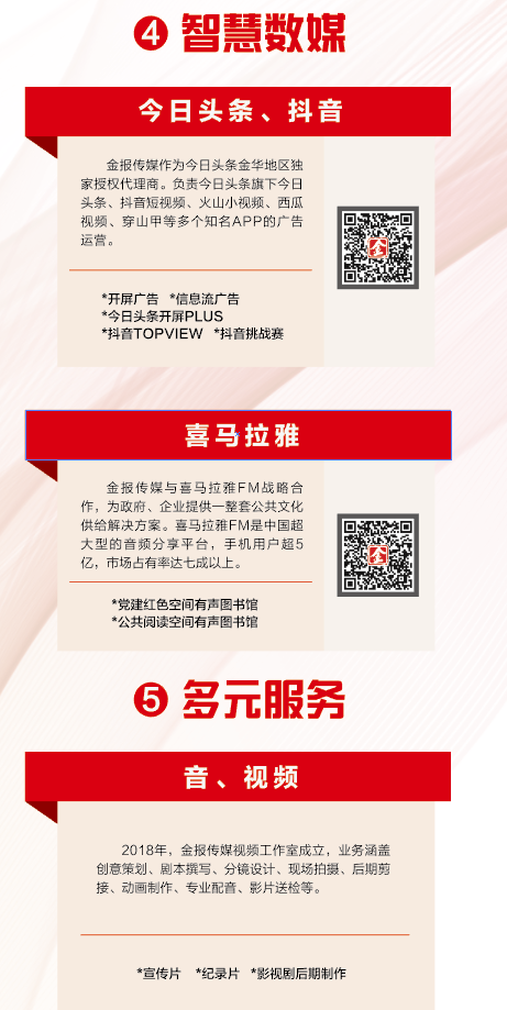 我们有丰富传媒,拥有1300余个高铁站广告位、1000多个社区灯箱广告位和200平方米的户外LED大屏;金报文化传媒与今日头条、抖音和喜马拉雅等智慧数媒头部公司有着良好的合作;我们还可以提供音视频制作、文化演出、会展和专业培训等多元服务……