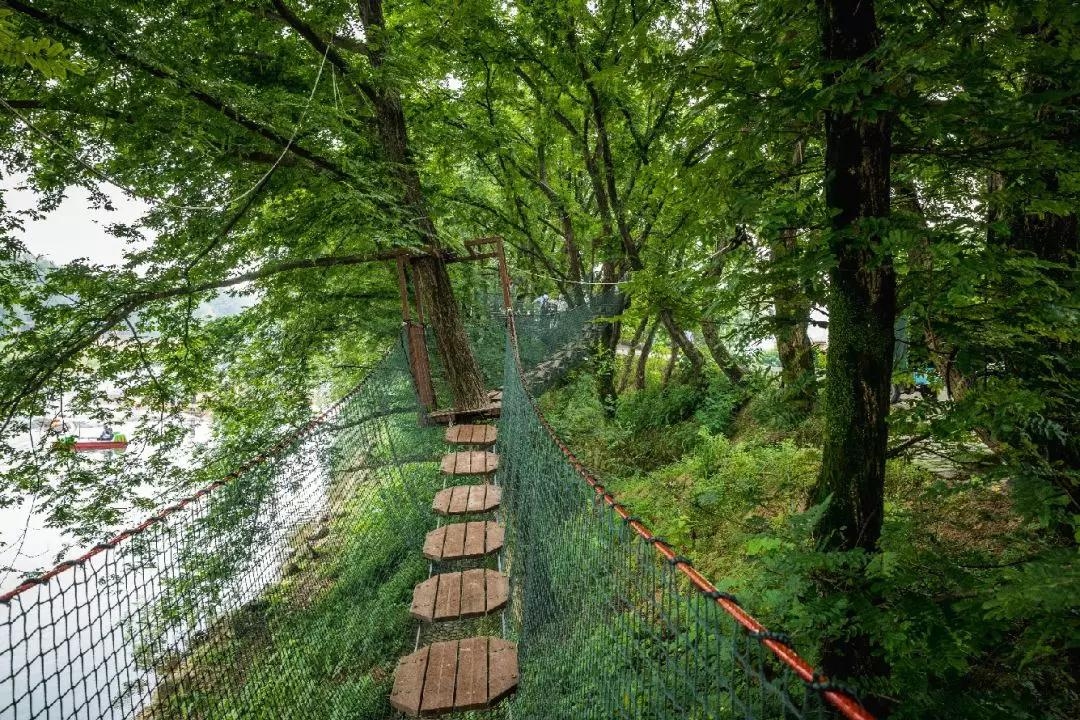 2018年越溪白鹤村因地制宜发展乡村旅游,建起林间索道、田野卡丁车、清水游船、水上乐园等。林间索道全长约160余米,在距地面2米左右高度的上空,两根坚固的钢丝上间断地铺设有或横、或竖放置的木板、木桩以及轮胎等,左右以及下面有U字形绳网加以保护,U字形两侧上方各有一条外面裹有橡胶的粗大钢丝供游客在行走时扶手和保持身体平衡。