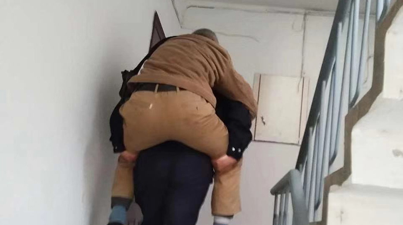 到了小区,得知老人家住五楼,沈忱主动蹲下身子示意老人趴到自己背上,稳稳地将大爷背起,从一楼到五楼,直到将老人小心安顿到座椅上。离开前,沈忱还不忘联系老人家属和社区志愿者,叮嘱他们多加注意老人情况,做好照看工作。