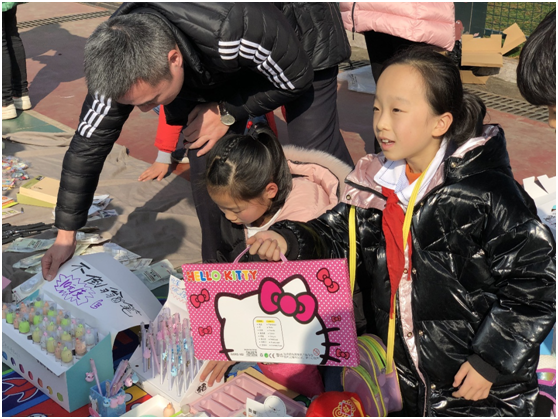 天气虽然寒冷,但是小卖家门都热情高涨,说起自己的收获,他们的话语里难掩兴奋之情。“这是我们家生产的水笔,质量可好了,一盒才要5元钱”一名四年级的小卖家自豪地指着自己的笔摊介绍,“我要把我看过的书都卖出去,这样我就可以买新书了。”一旁的五年级小卖家说;“去年我们组选的东西不好,今年我们都选了最热门的玩具,所以我们今年卖得非常好。”另一名六年级的“大卖家”高兴地说。