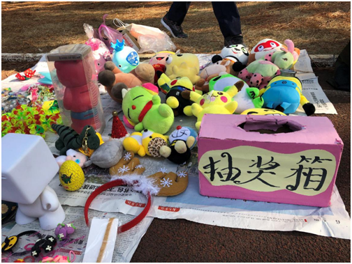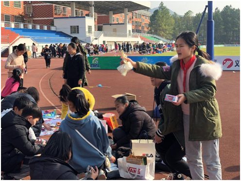 当天下午,操场上人声鼎沸、热闹非凡,吆喝声、笑声、讨价还价声可谓是声声入耳,商品玲琅满目,铅笔、书本、雨伞、围巾、毛绒玩具、魔方……,甚至还有家用电器。真是应有尽有,令人目不暇接。