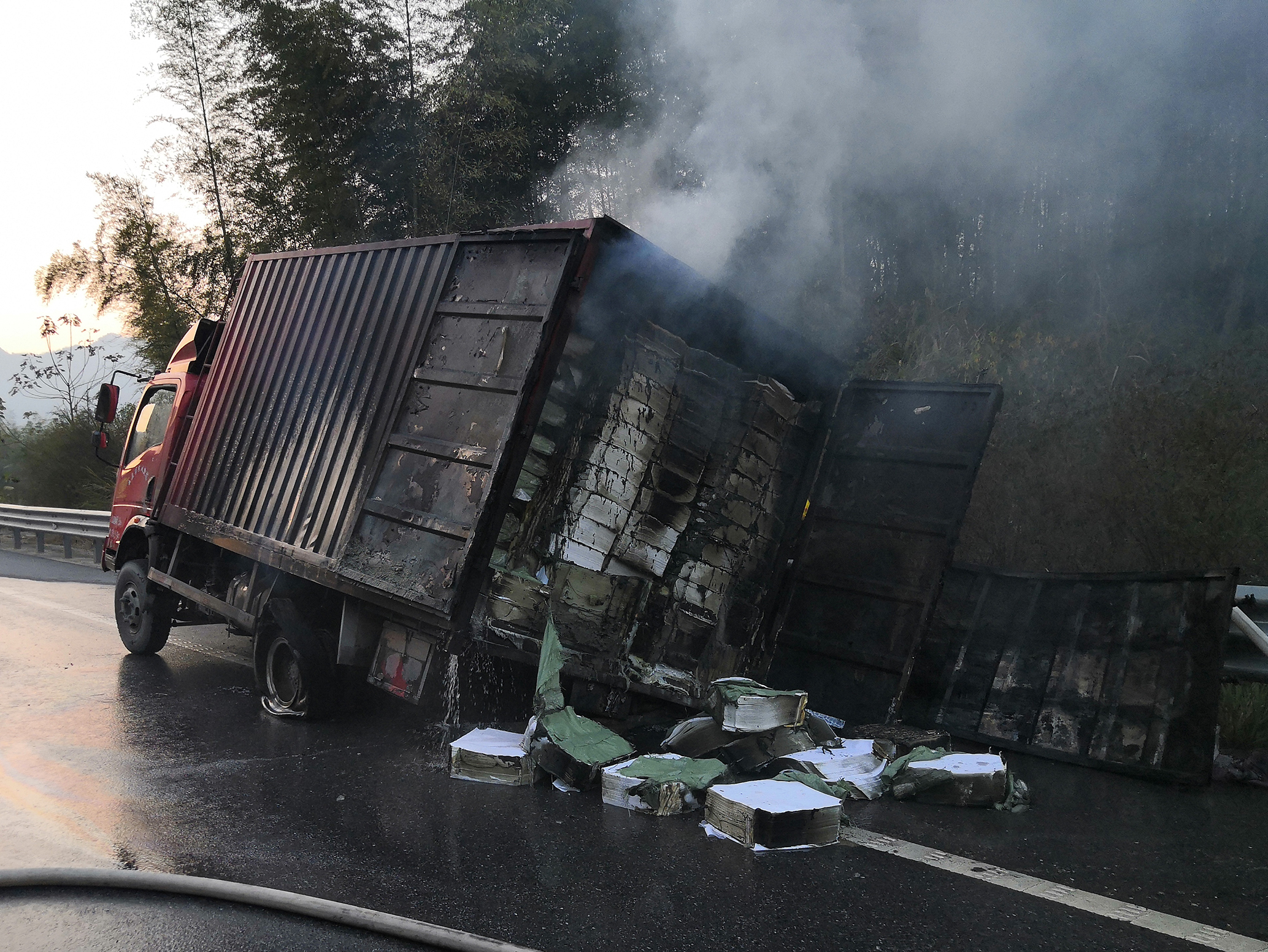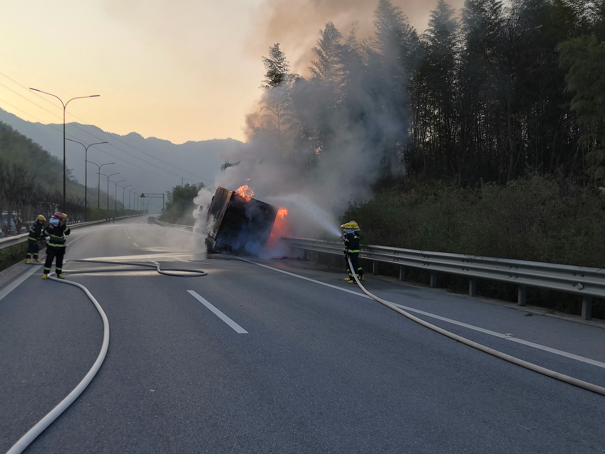 消防救援人员在距离高寿尖隧道口约300米处发现了起火车辆,只见一辆厢式小货车倾斜在路边护栏上,右侧轮胎已烧毁,满载塑料板材的车厢也已被大火包围,火势正不断向左侧油箱蔓延,情况十分危急。消防救援人员立即出两支水枪,一支水枪对准油箱喷淋冷却降温,另一支对车厢货物着火部位高压喷射。由于出事点正处山坡路段,附近无取水点,燃烧物又属塑料物质,融化后形成流淌火,两台水罐车轮番作战,一台去最近的取水点取水,另一台就在现场压制火势。经过二十多分钟的努力,火势终于被扑灭。