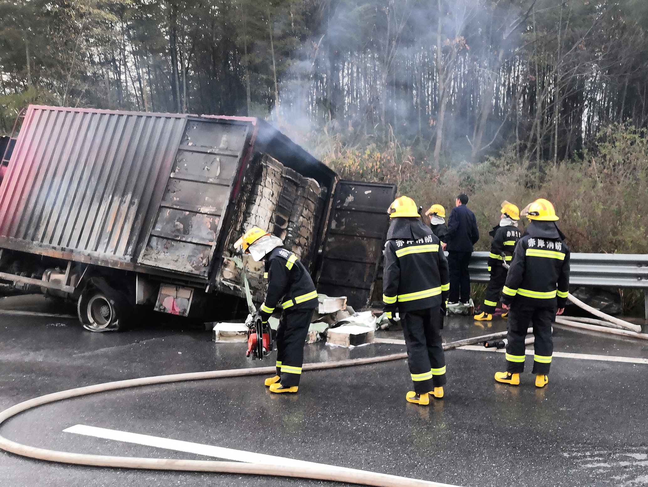 12月29日16时06分,义乌市消防救援支队119指挥中心接到报警称,义武公路高寿尖隧道附近一辆货车爆胎起火。接警后,消防部门立即调派救援力量前往处置。
