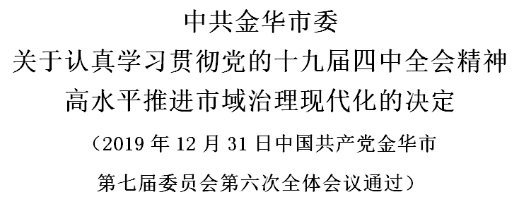 中国共产党金华市第七届委员会第六次全体会议,认真学习贯彻党的十九届四中全会、省委十四届六次全会精神,按照《中共中央关于坚持和完善中国特色社会主义制度、推进国家治理体系和治理能力现代化若干重大问题的决定》和《中共浙江省委关于认真学习贯彻党的十九届四中全会精神、高水平推进省域治理现代化的决定》部署要求,紧密结合金华实际,研究了高水平推进市域治理现代化问题,作出如下决定。