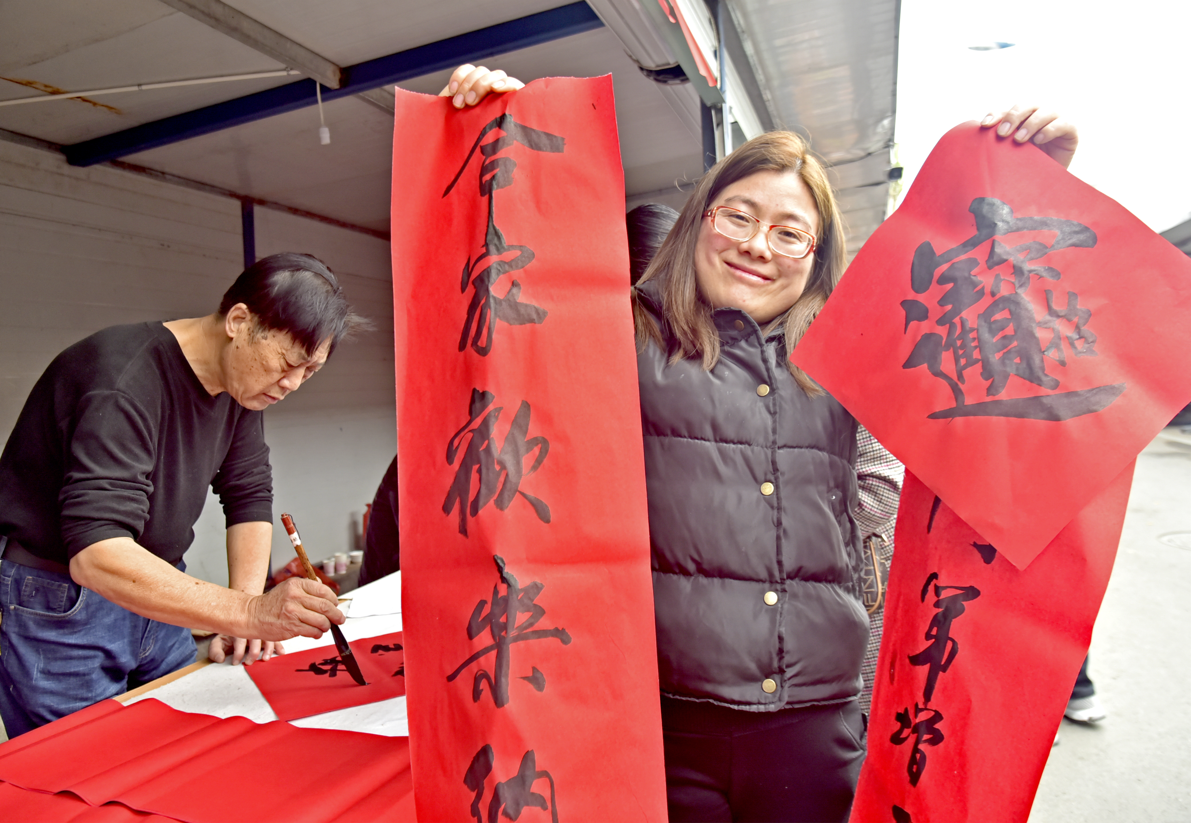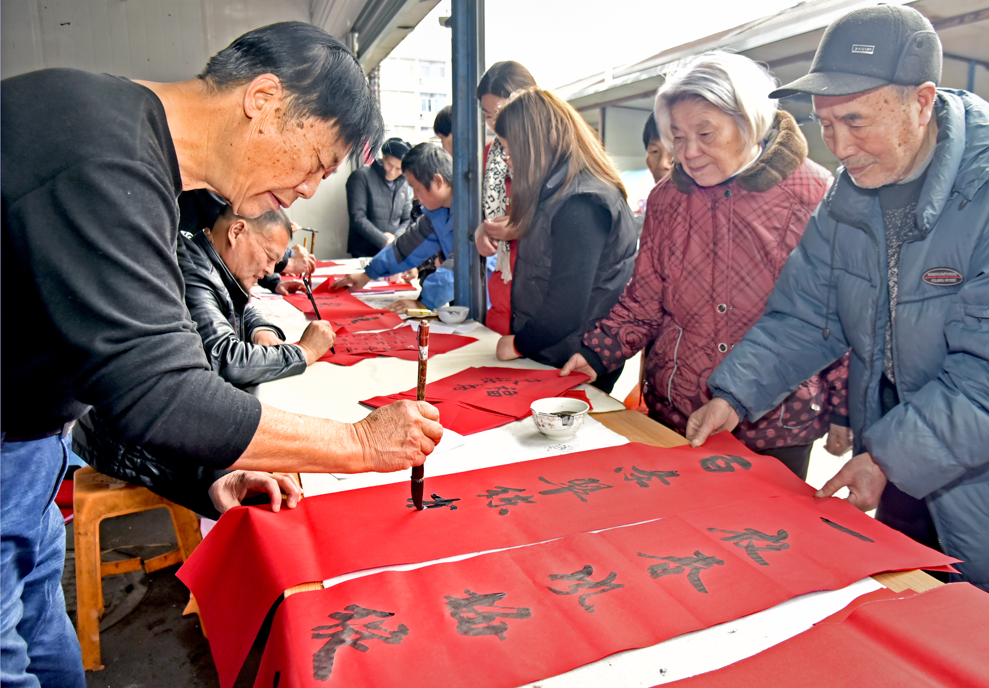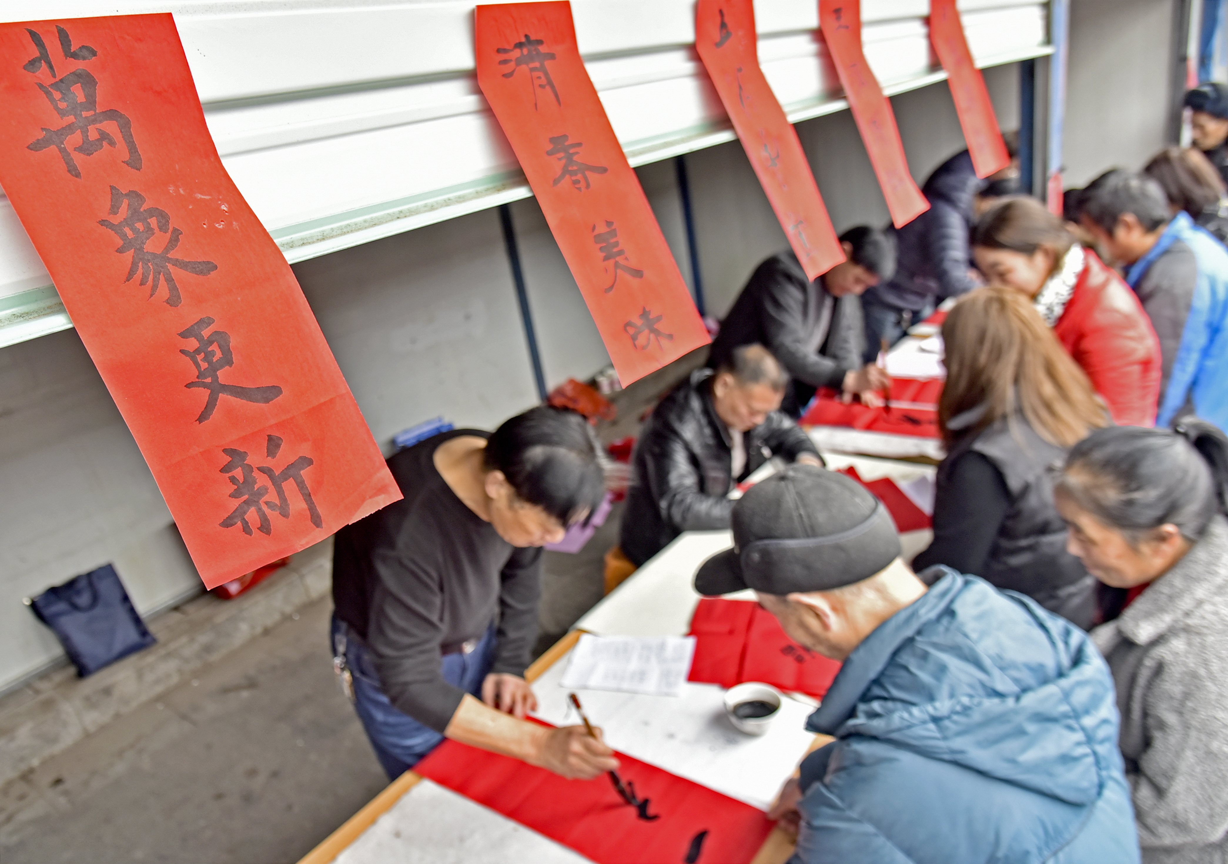 昨天上午,在婺城区白龙桥镇叶店综合市场里,叶益善等几位书法爱好者在免费为村民书写、赠送春联。据介绍,叶店村在2017年就荣获“浙江书法村”称号,一直以来书法氛围浓郁,而春节前夕利用书法特长为大家书写春联,已是村里的书法爱好者们近年来一直持续的保留传统活动,很受广大村民的欢迎。