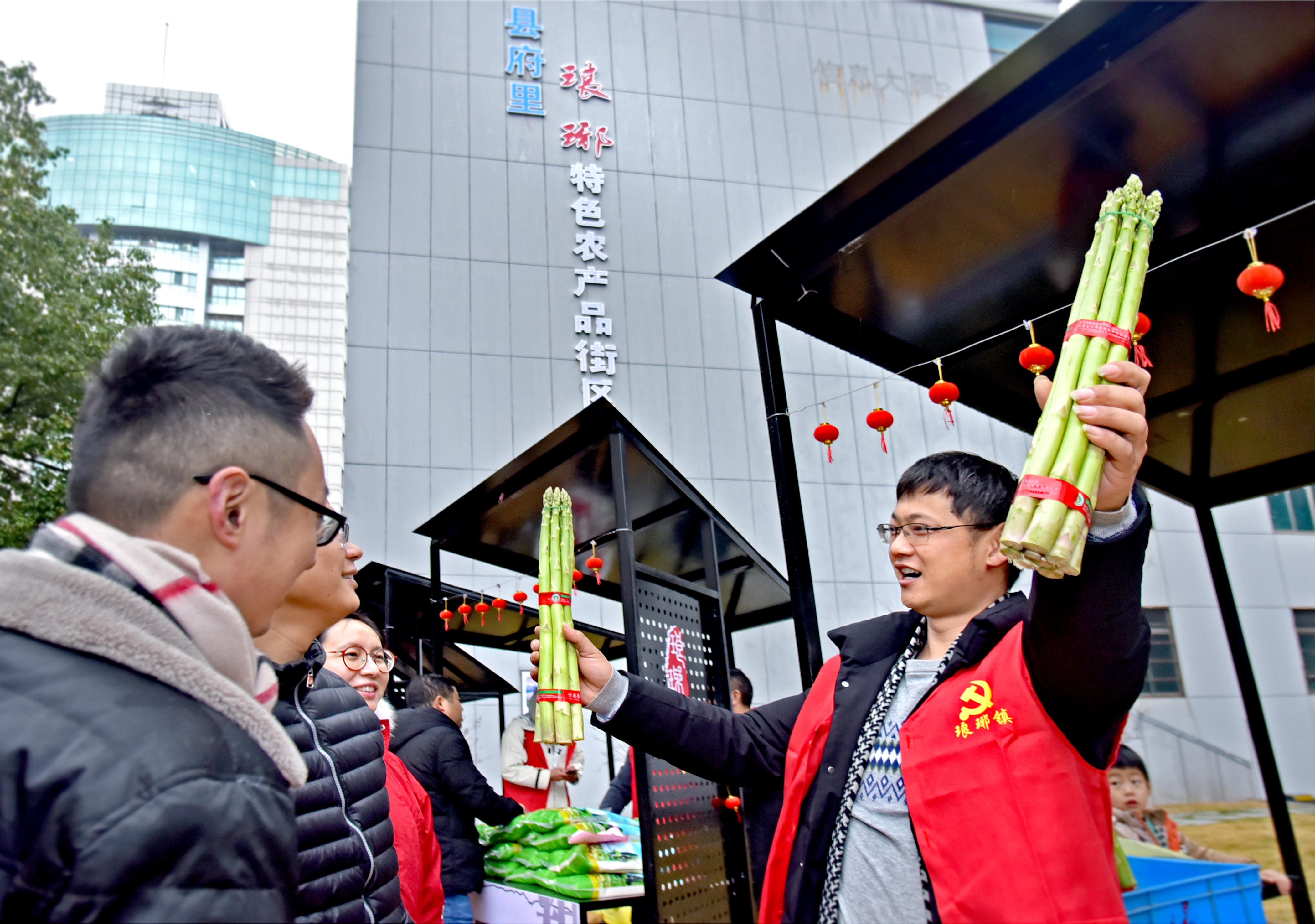 “县府里这个平台真不错,既能让城市居民能‘零距离’接触琅琊特色农产品,也能为我们进一步提高知名度,拓展销路。”方俊伟是绿色农产品“方安康”品牌负责人,其50亩的种植基地就在婺城区琅琊镇后金村。这次特色农产品街区开街,他带着招牌产品芦笋前来参展。