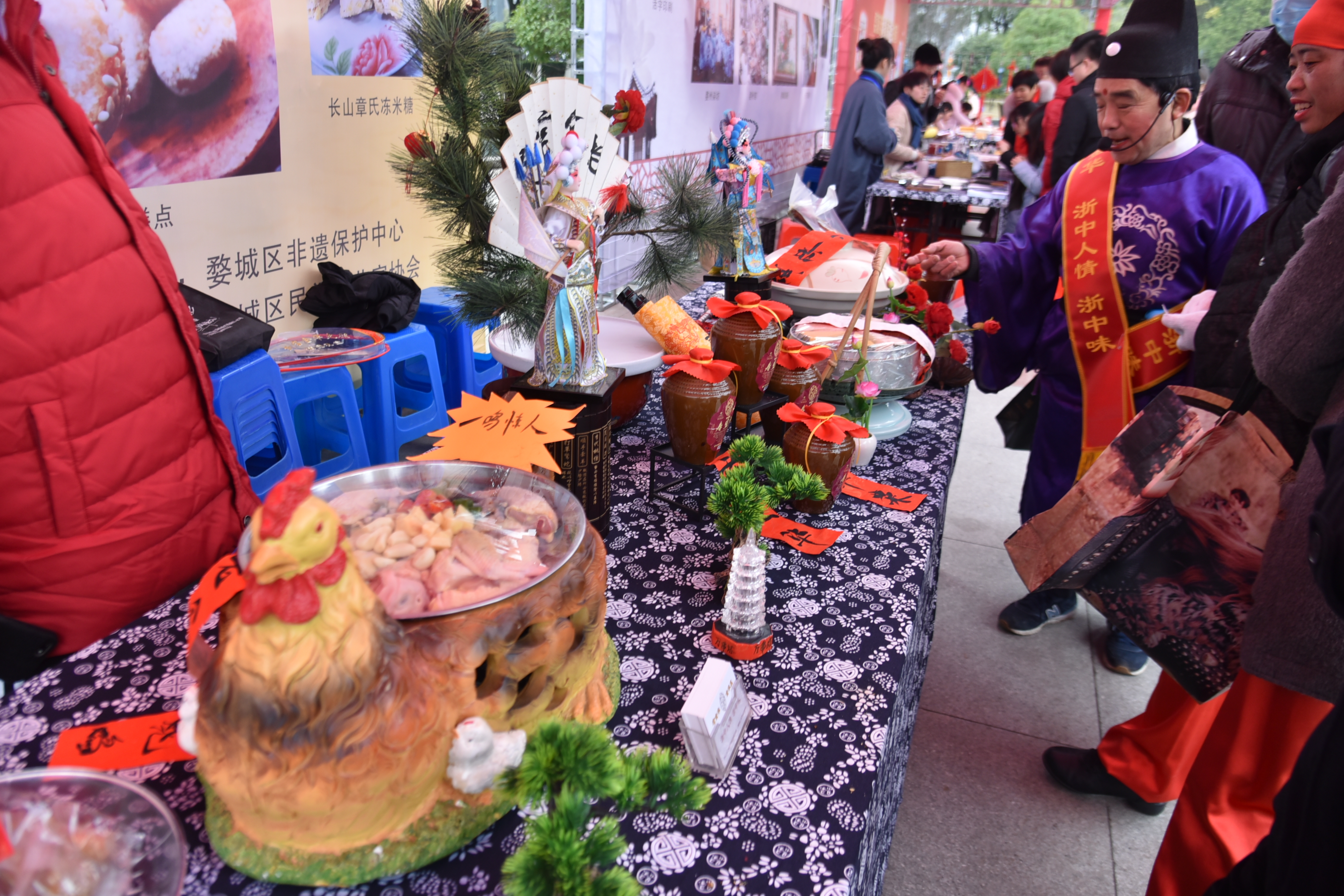 18日一大早,文化大过年活动还未开场,江北人民广场已是人山人海,最具人气的莫过于非遗手工技艺及传统美食展示。一幅幅寓意吉祥的婺城漆画承载着对新年的美好祝愿,引来一群白发老人携儿孙讲述那古老的婚俗;香甜酥脆的长山冻米糖、温润清甜的麦芽糖、传承自金华糕点厂的“糖古糕点”……一口口浓浓的金华味跳跃在“老金华”的味蕾,唤起儿时的回忆;火腿鸭、醋炒鸡、小米糕……系列金华传统名菜在现场一位道情老艺人的演绎和推介之下,除了令人垂涎,更觉有趣。