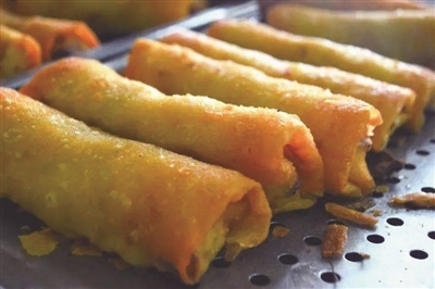一张面皮,夹上些馅儿,折叠成长短相宜、圆中略扁的形状。封头时,手指蘸些面糊,润一润春卷皮儿,再封头,便不易散了。热好锅、倒上油,用长筷子夹上一根春卷放入油锅,前后左右翻滚上一圈,色泽黄润,香气袭人,诱惑得你直冒口水。“纷藏丝缕缕,才嚼味融融”,唇起齿落间,味蕾百转千回,一股幸福与满足从心底化开。