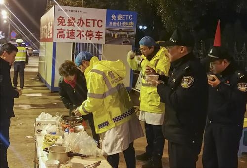 1月27日22时许,杭金衢高速兰溪游埠互通口出现暖心一幕,一名当地村民提着饭菜来到防控检查站,给冒雨执勤的民警和医护人员送餐。