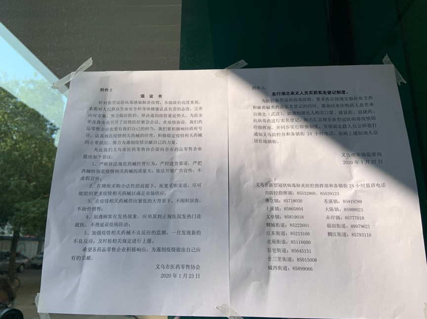 同时,为加强疫情防控工作,1月27日,市场监管部门向义乌医药零售协会下发了《防控疫情药品零售企业承诺书》,督促企业明码标价、诚信经营;渠道合法、质量保证;公开承诺、接受监督。并要求药店按规定做好处方药和麻黄碱类药品实名登记的同时,督促药店做好购买相关药物的湖北籍人员身份信息登记。