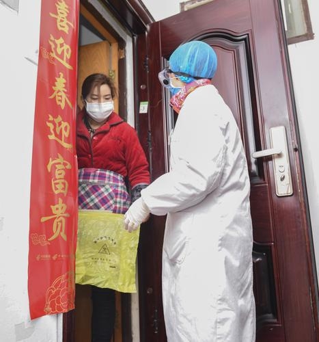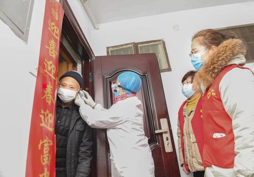 疫情防控,金华乡镇和街道在行动。1月30日,金华开发区三江街道社区卫生服务中心医务工作者杨英到居家隔离观察人员家中,为其测量体温,了解健康状况。