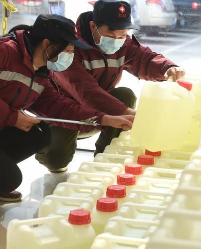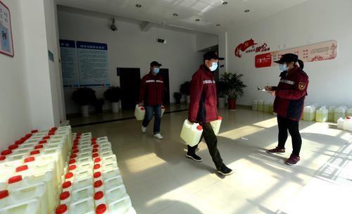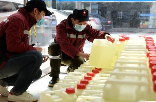 2月9日,在婺城区疫情防控指挥部物资仓库疾控点,婺城区疾控中心工作人员正在搬运清点含氯消毒液。据工作人员介绍,1月23日起,消毒液用于菜市场、超市、居民楼道、垃圾投放点、公共场地、办公场所等处喷洒消毒,截至2月9日已发放消毒液15.5吨。