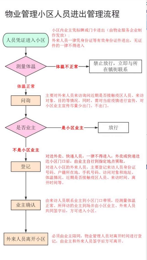 9.执行严格的外来出入登记制度(附录2),外来人员一律凭身份证件进出,对外来人员来访,必须询问近期是否接触疫区人员、来访对象、目的等情况,并由受访业主进行引领。