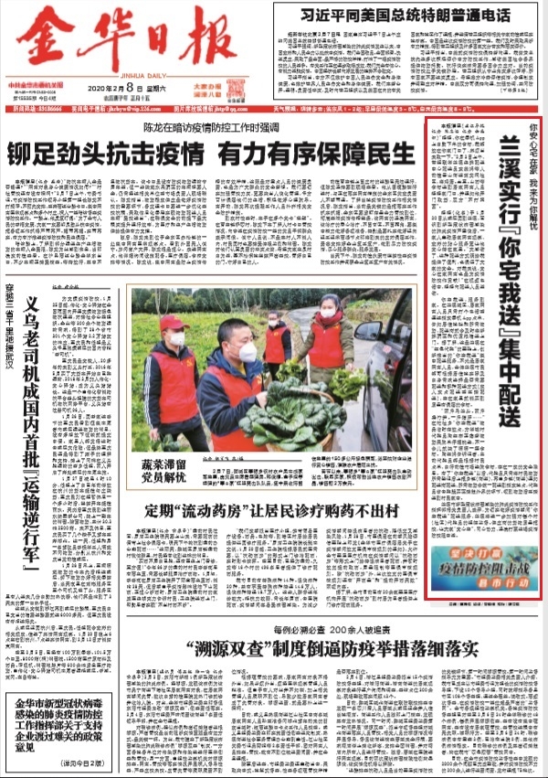 兰溪市新型冠状病毒感染的肺炎疫情防控工作指挥部相关负责人表示,为切实做好疫情期间“你宅我送”配送服务,兰溪将进一步加强对每个村(社区)代跑员的纪律监督、供应商的货物质量把控,让大家“安心宅”,同心协力,坚决打赢这场疫情防控阻击战。