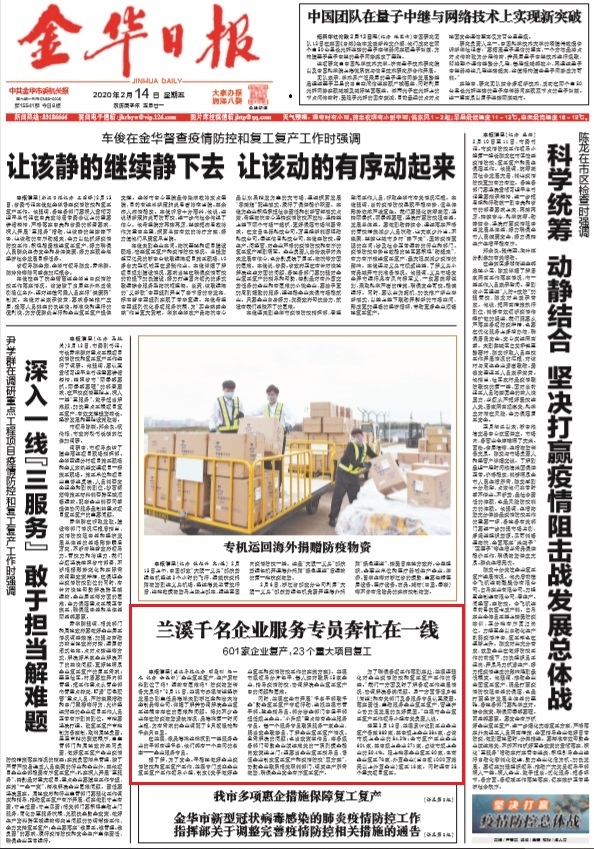 为了加强领导,兰溪市疫情防控指挥部增设了企业复工复产服务组,统筹协调各项工作。“我们一方面及时了解各服务专员工作进展情况,力所能及地帮助解决问题。另一方面督促各服务专员认真履责、落实责任,主动做好日常联络工作,齐心协力促发展。”企业复工复产服务组副组长童永生说。