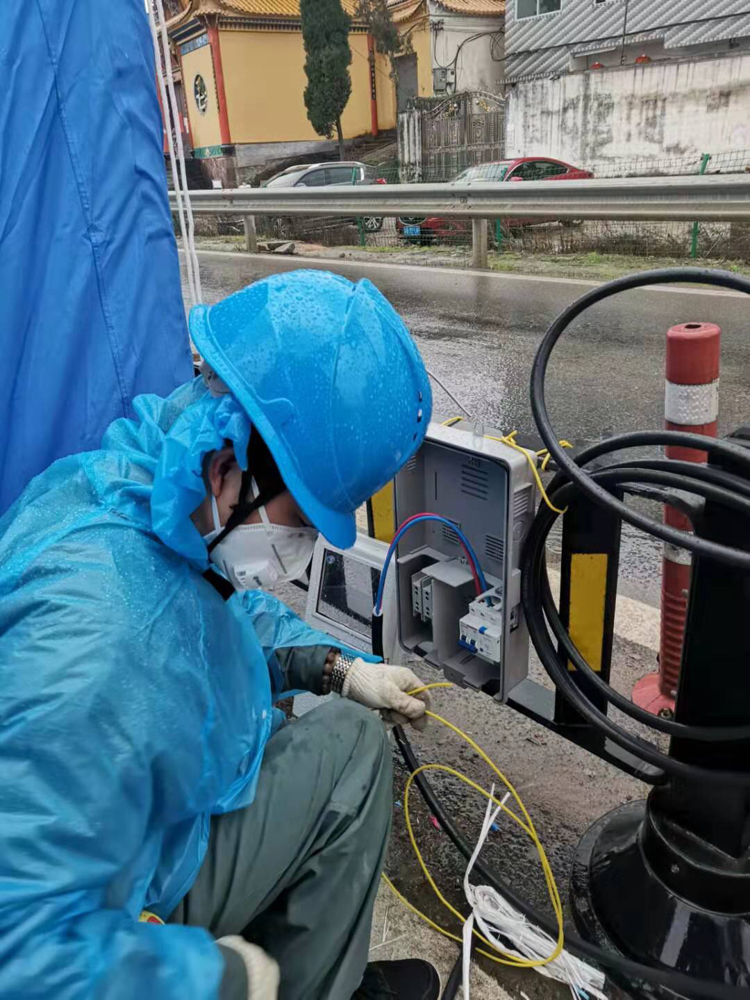 电力服务队员分工协作,在各高速口安装表计、开关,拉接线路,经过3个多小时不间断作业,于当晚7时许完成对义乌各高速路口检查点全部临时送电,助力疫情防控工作。