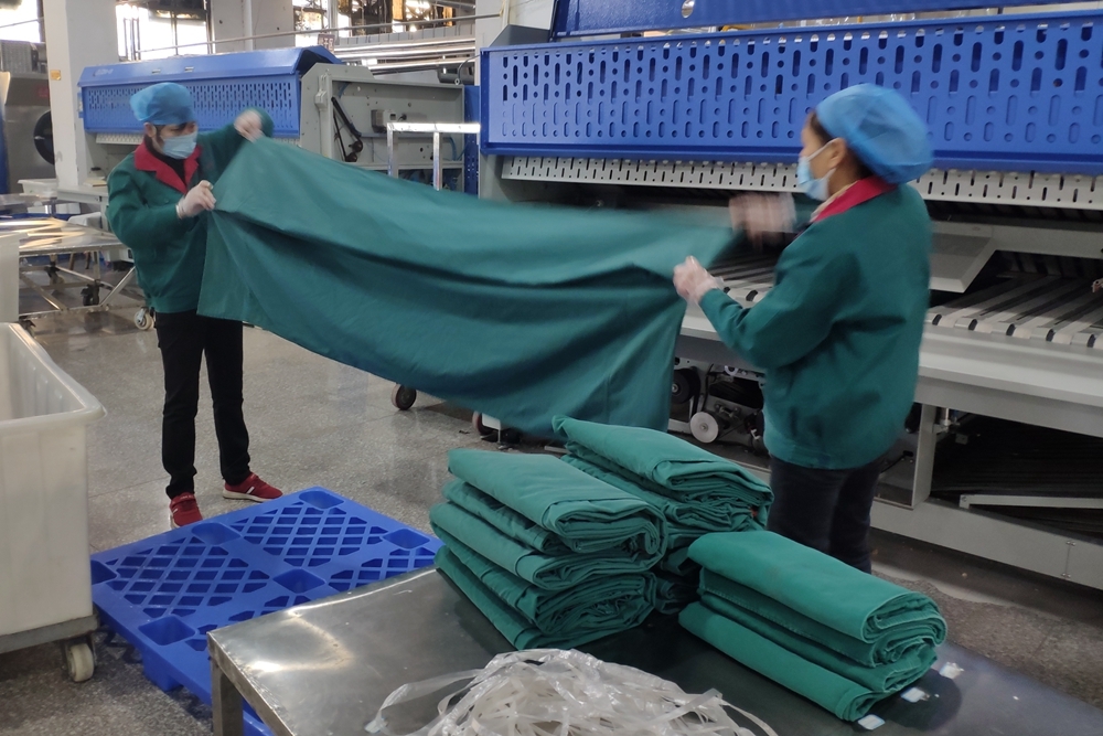 “往年,我们放假的时间为腊月二十五至正月初十。公司一共有45名员工,春节期间只需一半左右的人员留守。疫情发生后,义乌各医疗机构需要清洗消毒的医疗织物数量激增,达到甚至超过平时的量。我们迅速启动应急预案,召回了10多名在家休假的本地员工。”该公司负责人余梓君说。据他介绍,在这些急剧增加的医疗织物中,医护人员的工作服占了绝大多数。