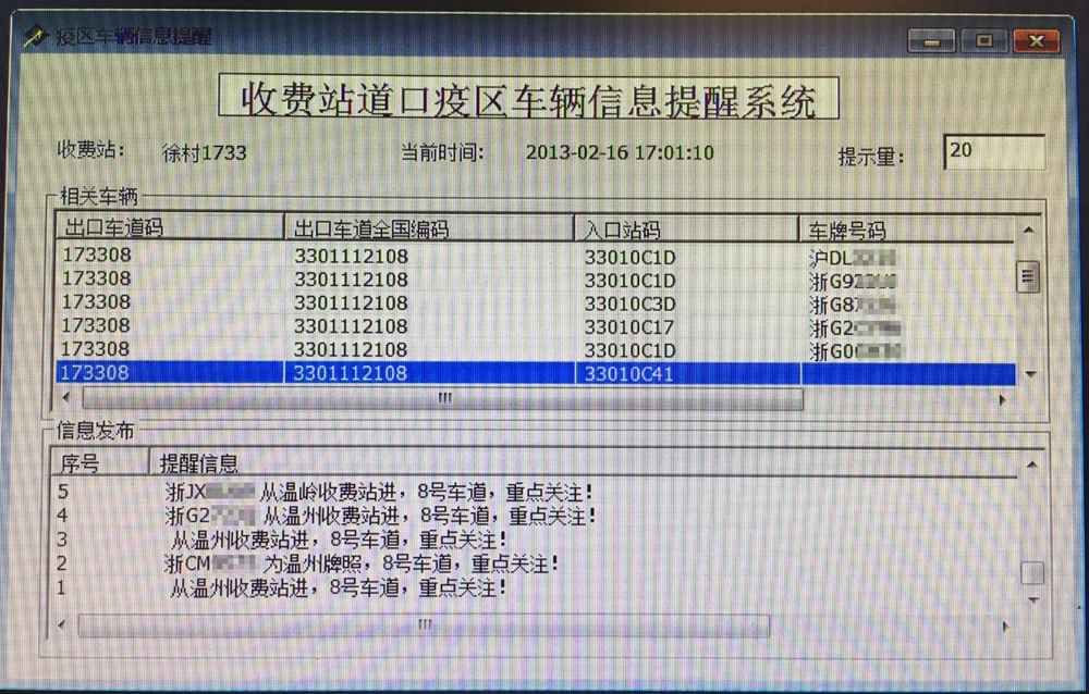 据了解,该系统有效应对“三返”人员复工高峰,对湖北、温州等重点管控区域驶入的车辆,通过对收费大数据进行分析,利用收费道口收费网络电脑部署程序,将车辆信息即时转化为语音,并通过收费亭原有语音播报系统进行播放,确保外广场“政企联合战‘疫’队”人员对重点车辆及时、有效开展检查。