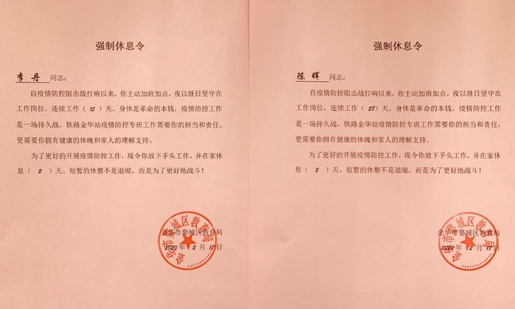 “李丹同志、陈晖同时,现令你放下手头工作,在家休息2天。短暂的休整不是退缩,而是为了更好地战斗!”2月17日,婺城区教育局发出两张“强制休息令”,强制“过劳”的“抗疫”铁军休息。虽然“强制”两字看起来有些不近人情,其实却体现着满满的关心与关爱。