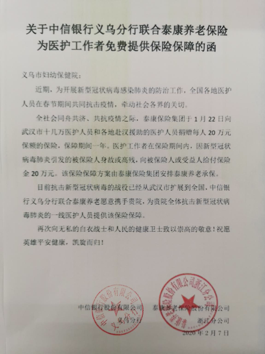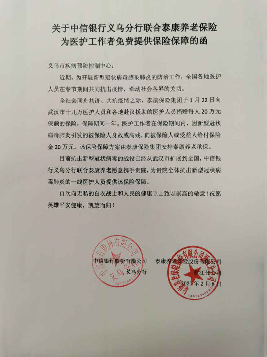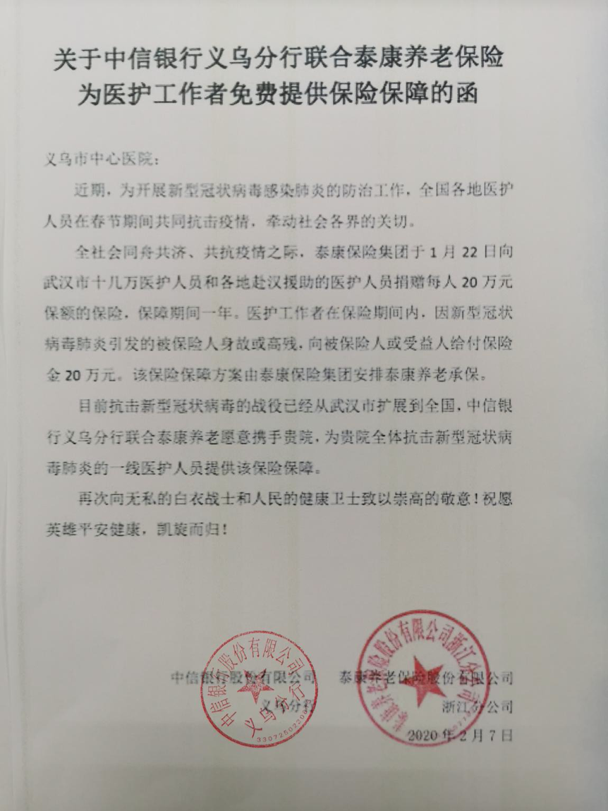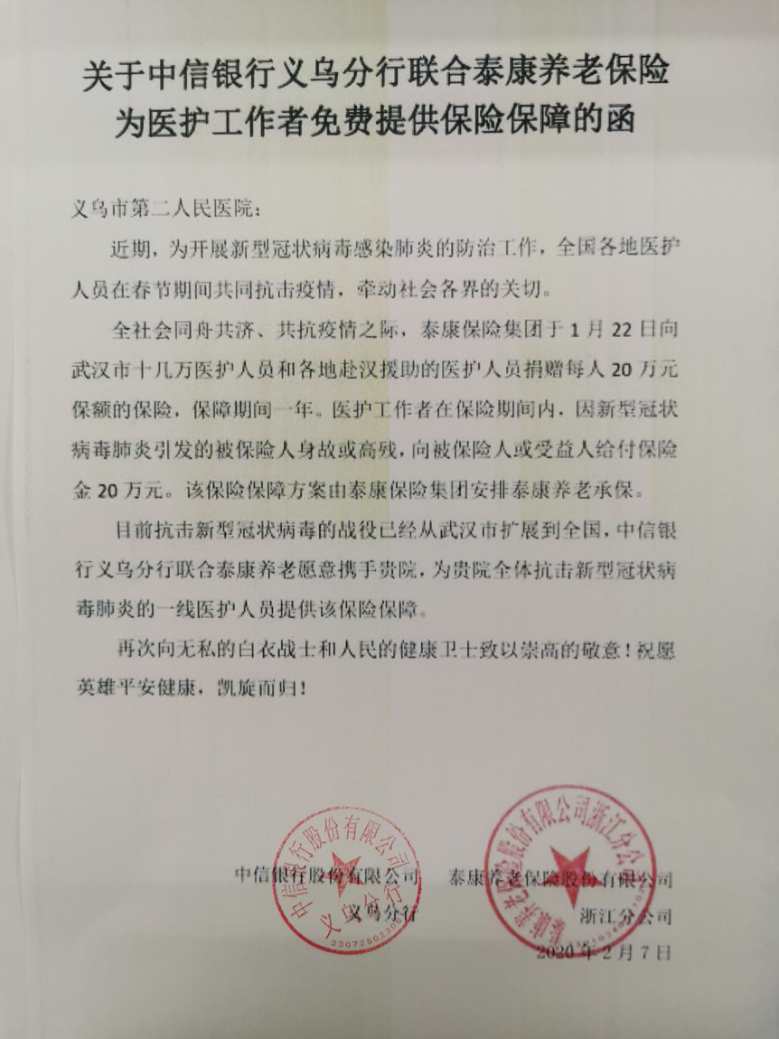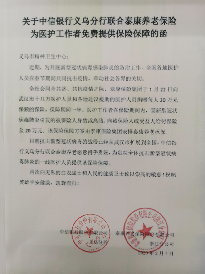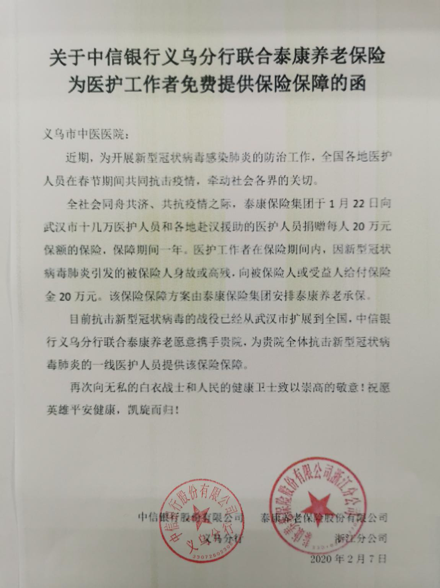 近日,中信银行义乌分行联合泰康养老保险公司浙江分公司,为奋战在抗疫一线的义乌市疾控中心以及义乌市二级以上公立医院的全体医护人员免费提供每人20万元保额的专项保险保障。投保人员覆盖7个单位医护人员,共计6116份(其中义乌市疾控中心98份、义乌市中心医院2209份、浙江大学医学院附属第四医院1570份、义乌市妇幼保健院928份、义乌市中医医院790份、义乌市第二人民医院417份、义乌市精神卫生中心104份),累计总保额12.232亿元,保单已于2月7日全部生效。