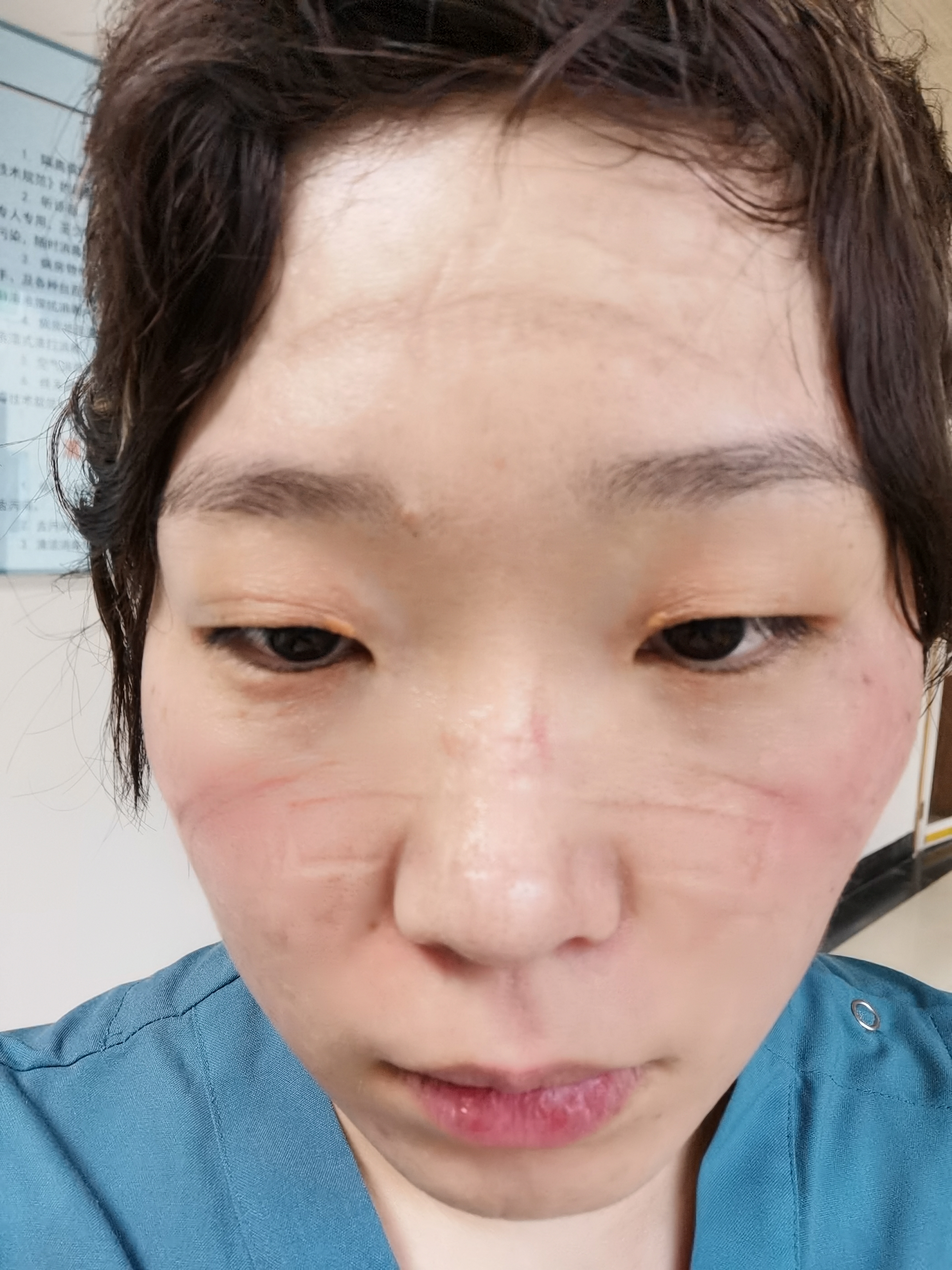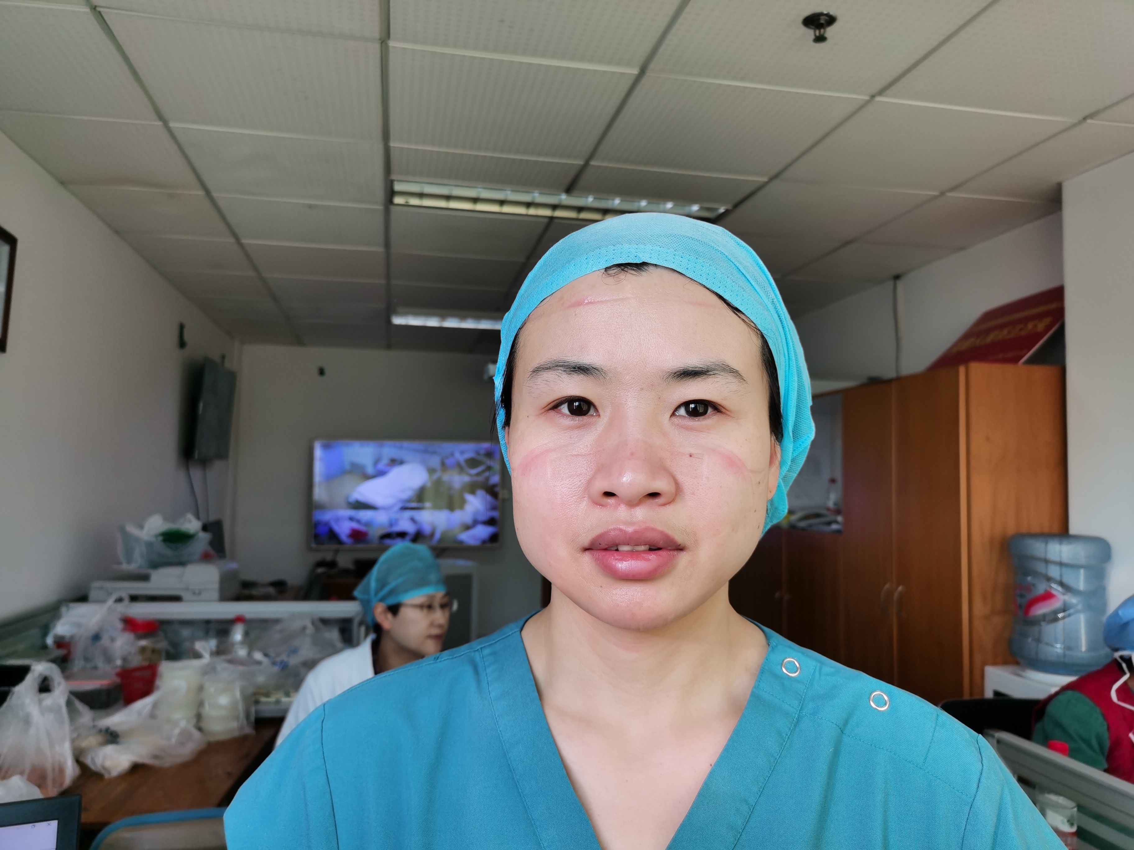 吴旻回忆,第一个班是白班,当时出来后脸颊两边是火辣辣地疼,直到晚上睡觉时摸上去还特别痛。看到满脸压痕的自己,吴旻说:“有些心疼,但更心疼大家”。