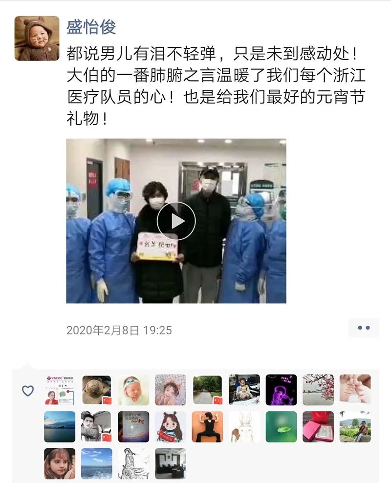 战斗 盛怡俊与浙江医疗队其他队员负责武汉第四医院两个病区、70多名病人的治疗,所有医护人员住在离医院15分钟车程的一家宾馆,工作实行两班倒。 大家面对的第一个挑战,是穿着防护服长时间工作。“难度远远超出之前的想象,试穿十几分钟,跟穿着三四个小时,完全是两种感受。”盛怡俊说,防护服不透气,穿一个小时后,衣服就会被汗湿透,穿着这样的衣服,还要不断地走动,查房、施治,因为病房里温度低,护目镜过一段时间就会起雾,看东西模模糊糊,为避免交叉感染,手不能去摸,更是难熬。 长时间高强度工作,加上穿着密不透风的防护服,对医护人员的身体和心理都是极大的挑战。盛怡俊生性乐观,他一边努力适应,一边想办法解决困难,护目镜起雾看东西模糊,他借鉴起别人解决汽车挡风玻璃起雾的办法,将洗手液稀释之后抹到护目镜上,方法简单又实用。 不仅如此,盛怡俊还将自己的乐观用在了病人身上,不断地鼓励他们。 “2月1日,我值夜班。跟往常一样,在电脑前认真地把所有住院患者的信息看了一遍,对患者的信息有了比较全面的了解之后,开始穿戴防护服、护目镜进入病房,一位位患者都要详细询问他们的病史,问他们有什么不舒服,饮食睡眠大小便情况,根据患者的病情及生命体征,调整机器的参数,我耐心地倾听患者的倾诉,鼓励他们要有战胜病魔的勇气和信心……医生本来就是一味药,有时直接用药物去治愈,有时用语言去安慰,让患者获得战胜病魔的勇气。”盛怡俊在工作日记中这样写道。 渐渐地,盛怡俊发现,自己的鼓励起到了作用,患者们的精神状态明显有了好转,给医生的反馈也越来越多。到后来,每当患者看到他去查房,都会反复说“谢谢”,眼里满是热切期盼。盛怡俊暗暗发誓,一定竭尽所能,守护他们的健康。 2月8日是元宵节,这一天,盛怡俊负责的一名75岁老人治愈。当得知马上可以出院时,患者及家属非常激动,握着他的手,希望留下名字和电话号码,盛怡俊婉说,他们的名字叫“浙江援汉医疗队”。当天,老人特意录下了一段视频,感谢医疗团队的悉心照顾。“都说男儿有泪不轻弹,只是未到感动处!大伯的一番肺腑之言温暖了我们每个浙江医疗队员的心,也是给我们最好的元宵节礼物。” 700多公里外,尹惠英也在自己的“战场”上竭尽全力。 尹惠英原本是社区服务中心输液室护士长,疫情发生后,她身兼数职,东奔西跑。 “物资非常非常紧张,我们每天都需要到隔离点和村社做防控和消杀工作,这些是保护一线医务人员的‘铠甲’,每天都焦虑到睡不着觉。”尹惠英说,发朋友圈,找熟人,她想尽一切办法筹集物资。 “有很多亲戚朋友看到朋友圈后到处为我打听,后来还有很多素不相识的人加我微信,捐赠口罩、医用酒精。还有区红十字会等单位,积极为我们筹集物资,捐款捐物……”尹惠英说,她遇到了很多善良可爱的人,让她虽觉处境艰难却倍感温暖。 1月31日,得知金华三例确诊病例治愈出院的好消息,尹惠英非常激动,她在朋友圈写下一段话:“它给医务人员和民众都带来了无比的信心,相信在全体医护人员的努力和老百姓的密切配合下,我们一定能尽快打赢这场抗疫攻坚战。”