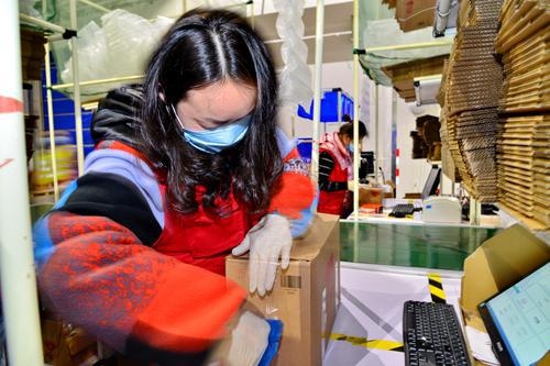 2月26日,金义综保区考拉海购保税仓里,工人们正进行产品包装和发货。据了解,外贸进口企业“考拉海购”积极采取措施复工复产,为华东地区的消费者提供丰富的进口商品。