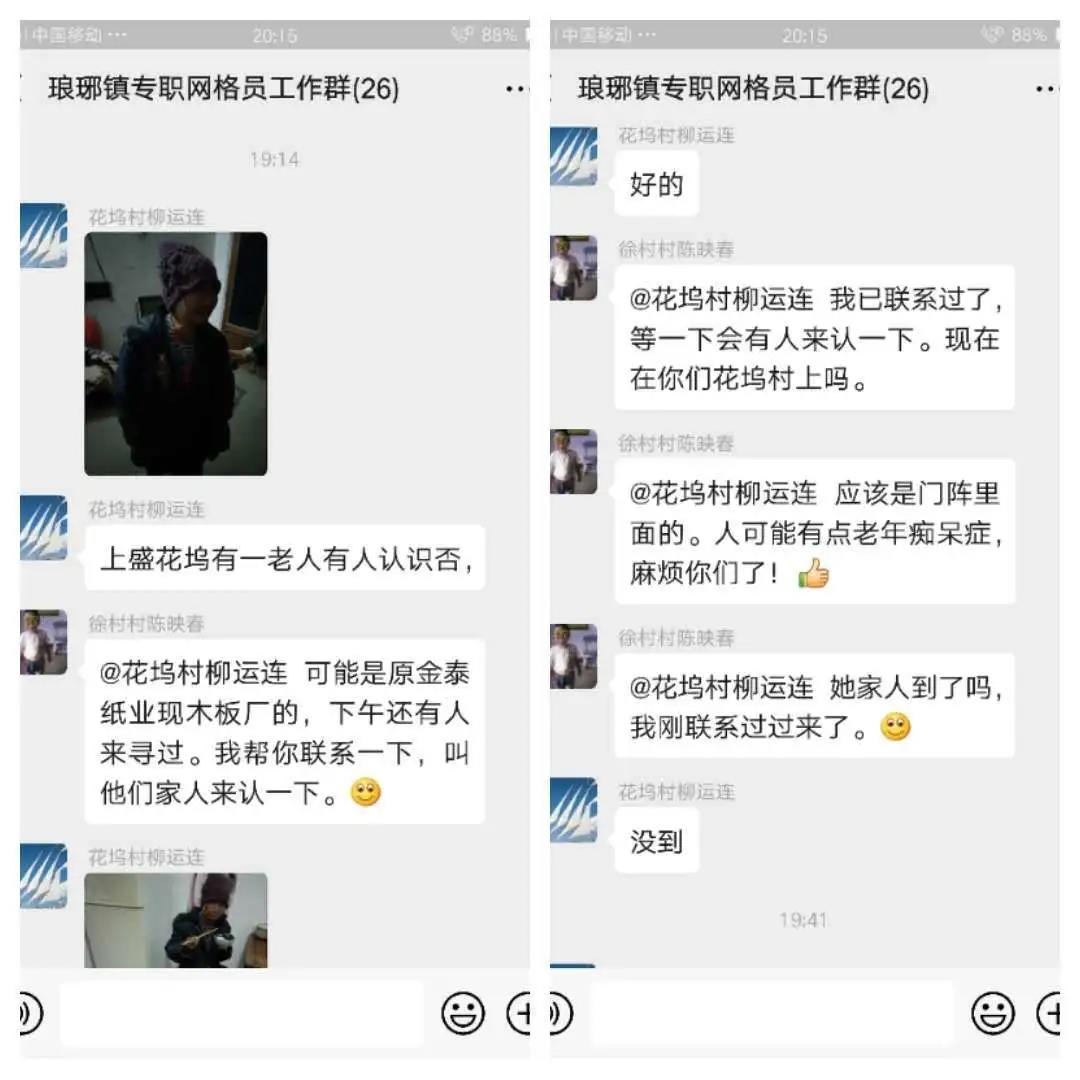 2月26日,婺城区琅琊镇专职网格员工作群,花坞村网格员柳运连在群里发了一张走失老人照片和求助启事后,群里立刻发起了一场爱心接力。