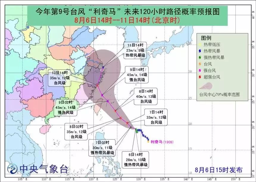 兰溪市气象台2019年8月6日17时50分发布台风动态:今年第9号台风"利奇马"(强热带风暴级)于8月4日下午在菲律宾以东洋面上生成,今天17时其中心位于台湾省台北市东南方大约1000公里的西北太平洋洋面上,预计"利奇马"将以每小时10公里的速度向西北方向移动,逐渐向浙闽沿海靠近,强度逐渐增强。受其影响,我市将有一次风力增大和较明显降水过程,预计8日受"利奇马"外围环流影响,多云到阴,有时有阵雨或雷雨;9~11日受其环流影响,有较明显降水,风力增大。