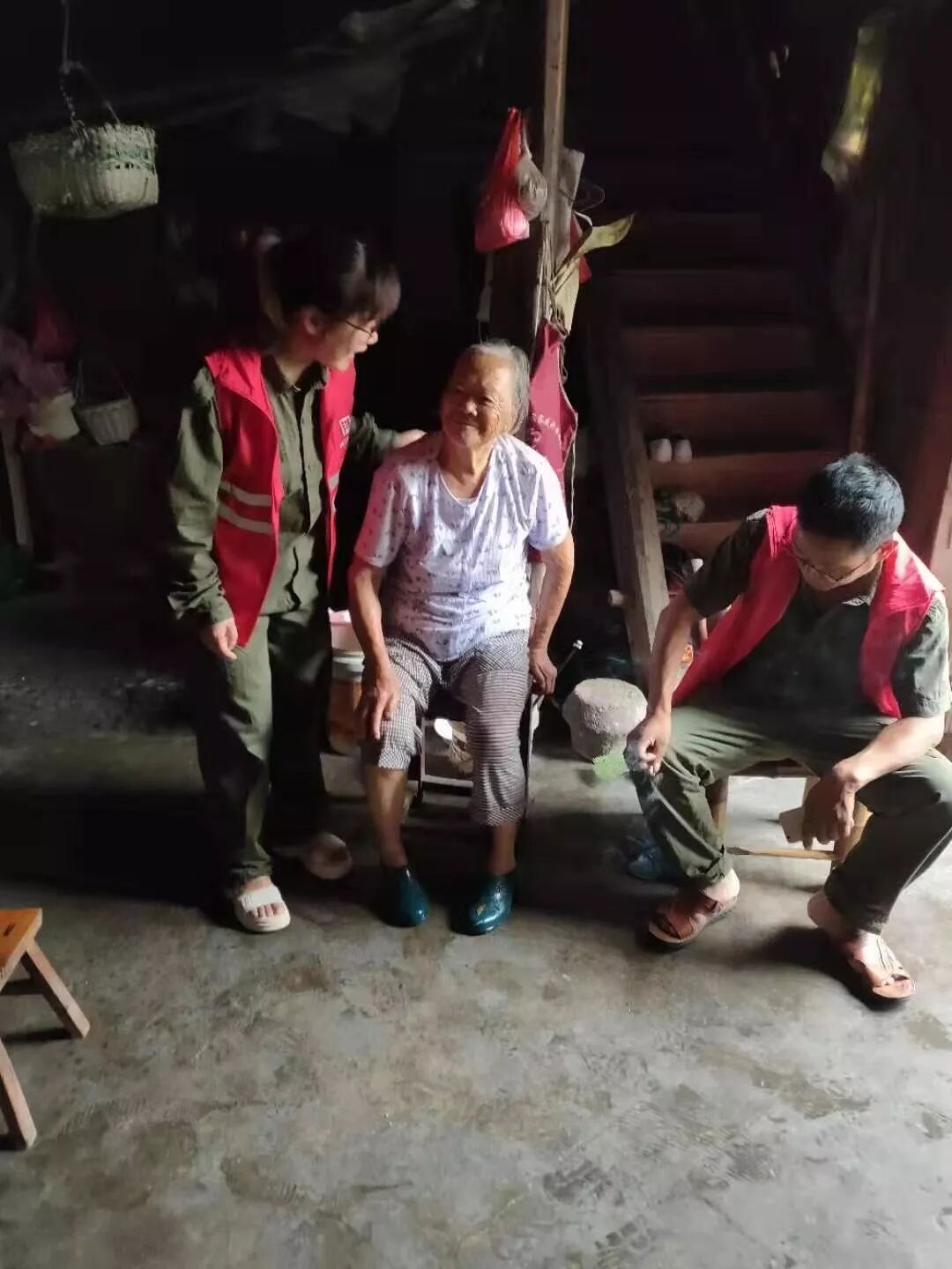 讨论完毕,双溪村的网格队伍分成了两个小分队分别前往辖区的几个自然村进行巡查。当双溪村网格第一分队到82岁独居老人郑桂娥家时,郑桂娥老人正一个人坐在门边上看着外面刮着的大风和阴沉的天气,她家的房子还是建于40年代的泥土房,比较破旧了,儿子又常年在外打工,这样的情况牵动着双溪村网格员们的心。“奶奶,台风来了,你别怕,我们来了。你跟我们一起去别的地方呆几天好吗?”双溪村专职网格员章月萍拍着郑奶奶的背说。郑奶奶很配合,颤巍巍笑着说:“好囡囡,好囡囡,这次风刮的这么大,我一个人正担心呢,谢谢侬,谢谢侬!”劝好郑奶奶后,网格员们一起帮助她收拾了一些日常用品,转移到了村里的避灾点。