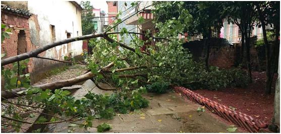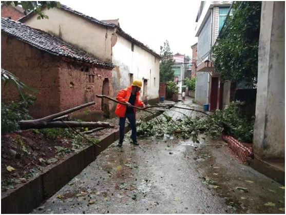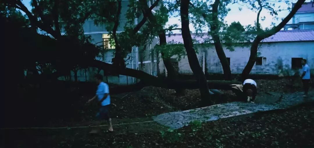 果不其然,随着大风一阵比一阵强烈,村中的一颗大树终于忍受不了狂风的撕扯,倒下了身躯,横亘路中!太危险了!如果不及时清理掉,很多晚上上夜班骑车的人如果在不知情的情况下撞上去,可就要出事了!想到这些,网格员们马上开始行动,准备好工具、绳索。不一会儿,人与工具都凑齐了。大家冒着风雨,马上开始动手锯木头。在全体村两委和网格员们努力下,树枝被锯断清理,安全隐患成功解除。