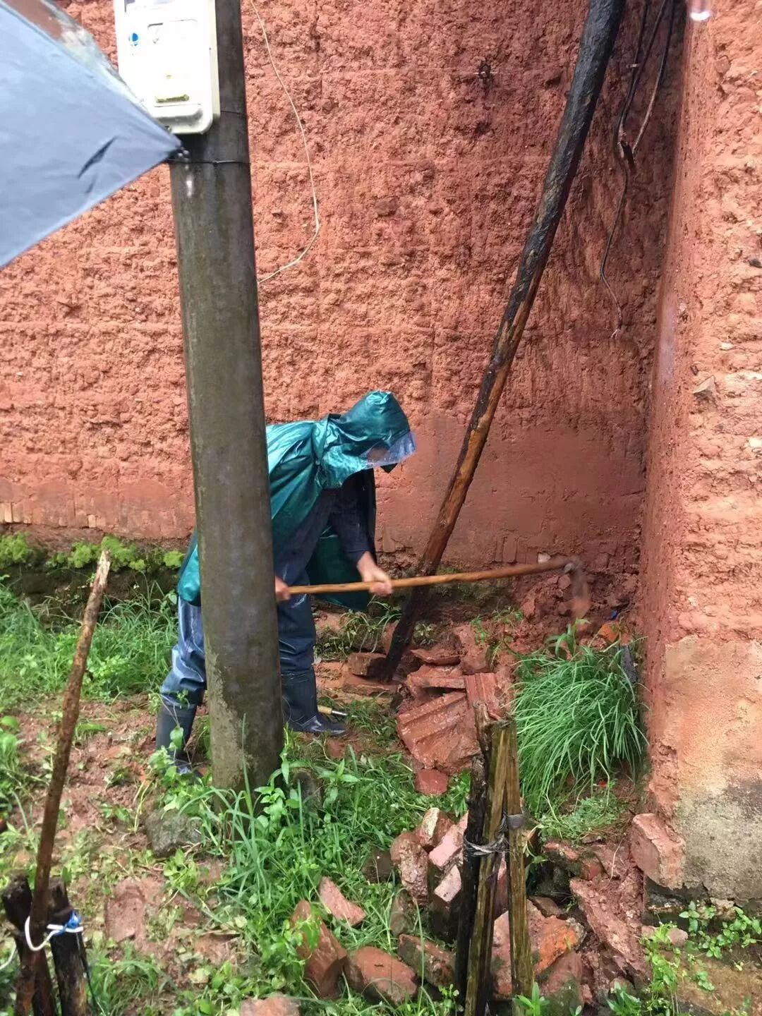 河伯村尚方自然村汤渭潮农户家的厨房受到连夜台风和大雨的影响,墙体受潮,有部分坍塌,河伯村网格员方国君了解情况后,第一时间赶到现场,先是用防水油布进行铺盖,防止墙体再受潮,然后对坍塌部分进行清理,经过方国君的努力,墙体坍塌问题成功化解。