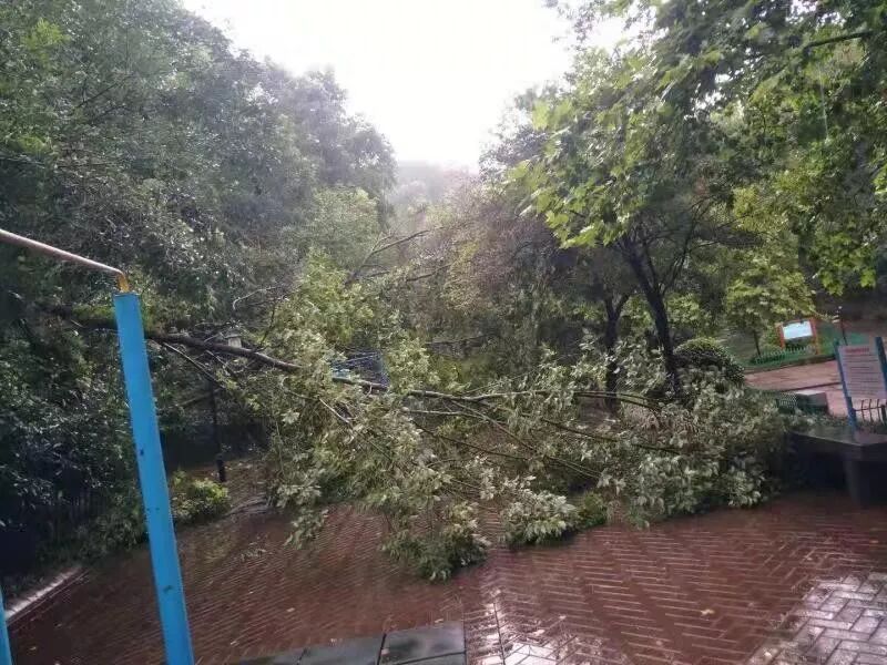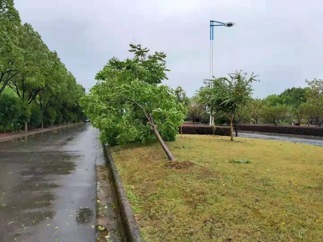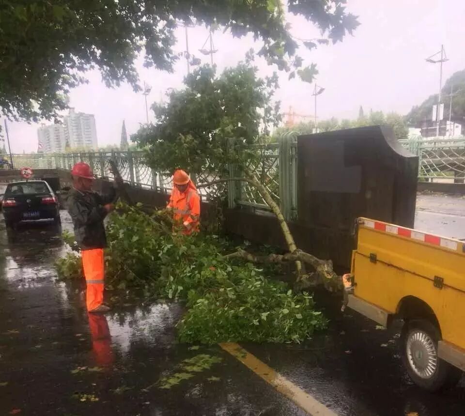 园林工人第一时间清理倒伏残枝,保障出行安全畅通。